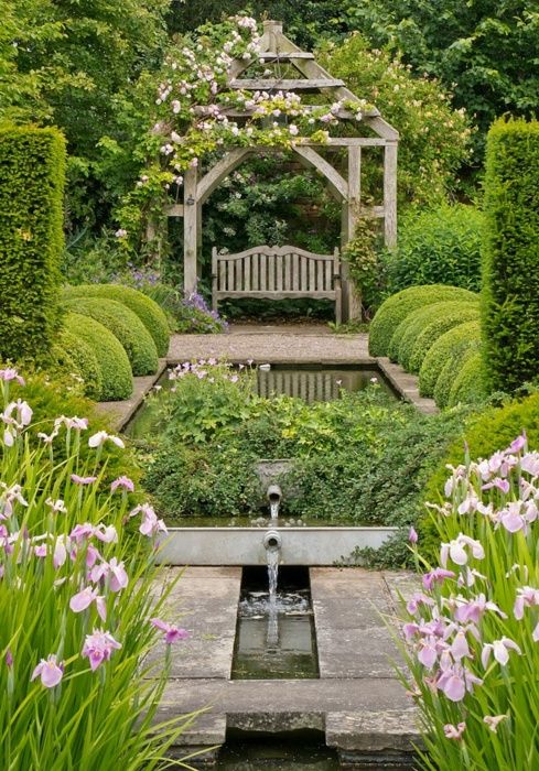 apa este un element obligatoriu in cadrul unei amenajari in stil geometric, aducand prospetime, lumina si miscare. Ea reprezinta elementul cel mai bogat datorita modalitatilor de folosire si combinare cu diverse alte elemente, fiind dispusa in bazine cu margini de marmura sau piatra artistic cioplita si finisata.
