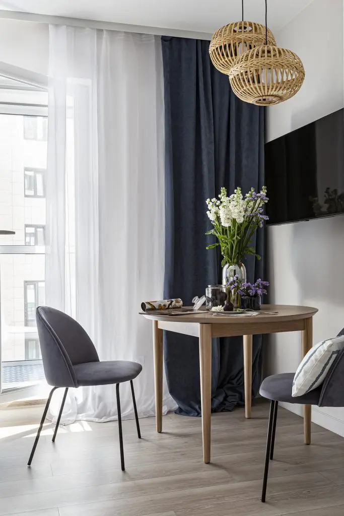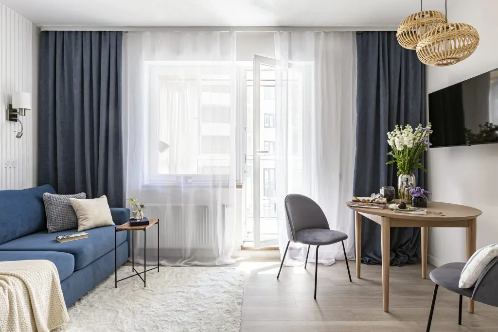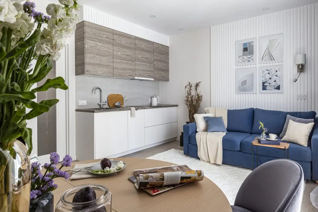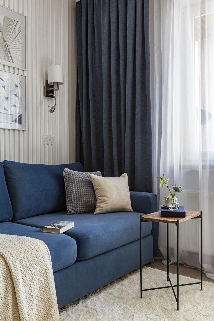 Combinatia de culori neutre reuseste sa creeze o atmosfera calma, relaxanta. Nuante de albastru au fost inserate in piesele de decor si mobilier pentru a pune in valoare caracterul spatiului.