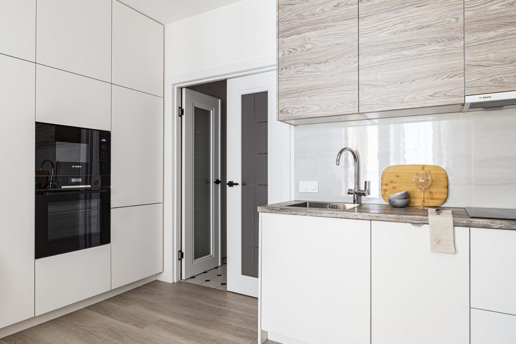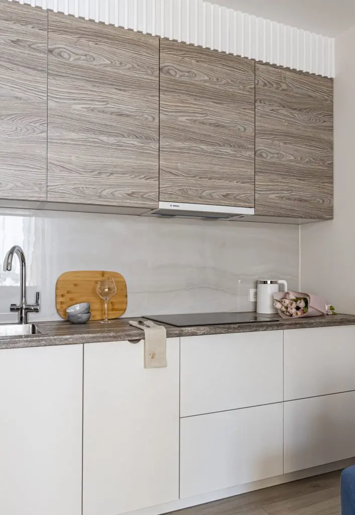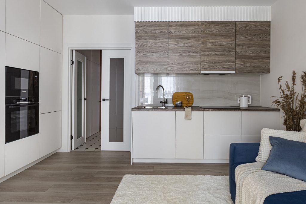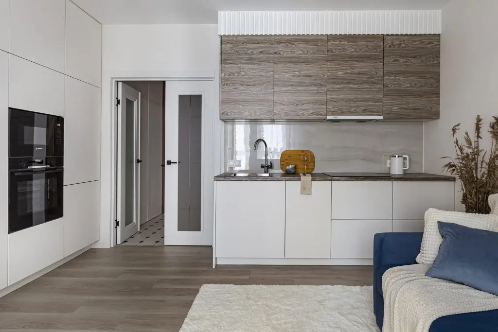 Designerii au propus acele panouri riflate albe in spatele canapelei si deasupra mobilierului de bucatarie suspendat ( mascand tubulatura de ventilatie) pentru a contura mai bine conceptul amenajarii si a defini un spatiu unitar, coerent din punct de vedere stilistic.