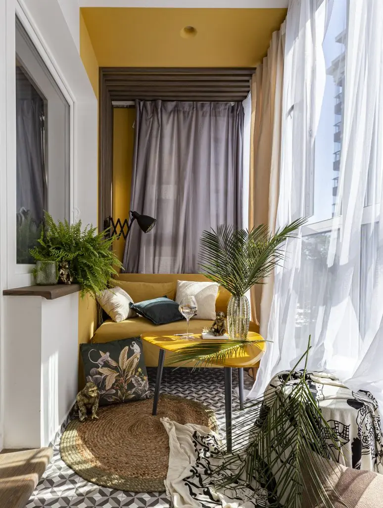 Zona de living a fost atent impartita in zone de recreere, de gatit si depozitare; logia vine in completarea spatiului interior, a fost creat separat un spatiu de odihna si depozitare (extrem de util). Fiind gandita ca o vacanta cu mult soare, amenajarea balconului are in prim plan nuanta de galben deschis a vopselei lavabile aplicate pe pereti si tavan, si a materialului canapelei; accentuand centrul de interes.