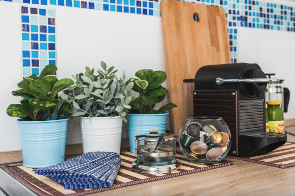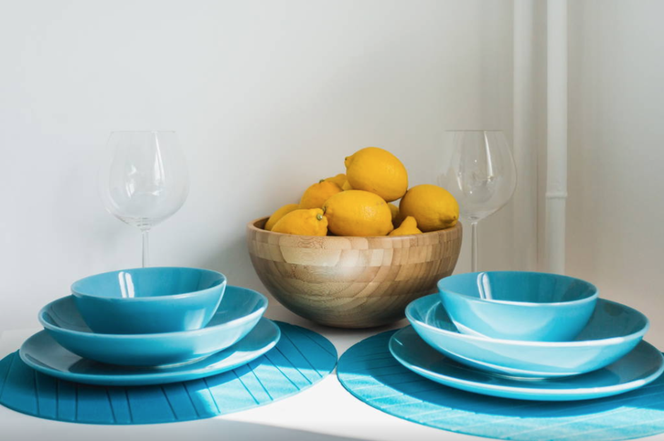Si in bucatarie a fost pastrat mobilierul, dar si pardoseala, ambele in conditie buna si usor de valorificat. Amenajarea de aici este simpla, cu cateva mici detalii colorate si un mozaic cu albastru-turcoaz ce aminteste de tematica din restul casei. Iata cum o bucatarie banala poate fi reamenajata cu cateva decoratiuni simple, dar de mare efect: scaune in spiritul stilului cromatic ales, vesela si suporturi ceramice colorate pentru flori, plus o zugravire noua a peretilor si o draperie in stil roman, bineinteles tot in albastru.