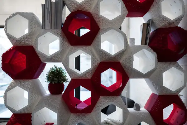 Fatetele exterioare creeaza o reflectie a luminii si o variatie de umbre, continuate subtil pe suprafetele interioare, adaugand o textura aproape tactila. Plasticul folosit la printarea acestui produs, alb opac si rosu translucid, permit luminii sa treaca prin modulele componente si produc efecte deosebite in interiorul incaperii.