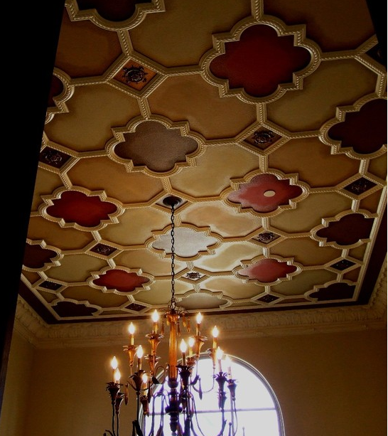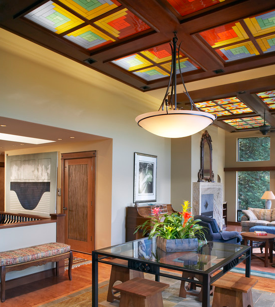 Un tavan din casete cu vitralii ofera multa eleganta si distinctie unei incaperi, mai ales cand imbini culoarea grinzilor cu cea a mobilei si a tamplariei din restul camerei.