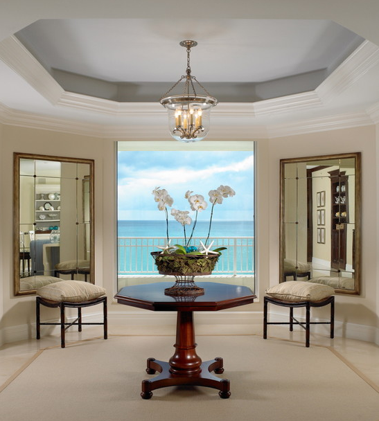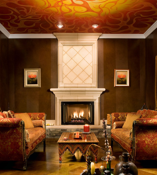 De cele mai multe ori, in amenajarile clasice de la noi din tara, tavanul este decorat in alb. In unele cazuri insa el poate fi infrumusetat cu ajutorul unor elemente decorative care pot varia de la dungi colorate la muluri (element decorativ in relief facut pe suprafata unui zid) care ofera amenajarii o senzatie de adancime.