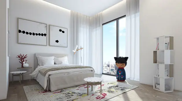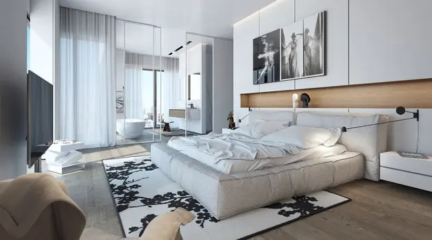 Dormitorul principal mentine aceeasi linie, dar lemnul natural isi face putin mai mult loc in amenajare. Spectaculoasa este trecerea din dormitor spre baie, prin usile culisante transparente si draperiile diafane folosite pentru intimitate. Un al doilea dormitor, care ar putea fi destinat copiilor sau oaspetilor este mai mic ca suprafata, insa, face loc unor stropi de culoare si unor accesorii foarte vesele.