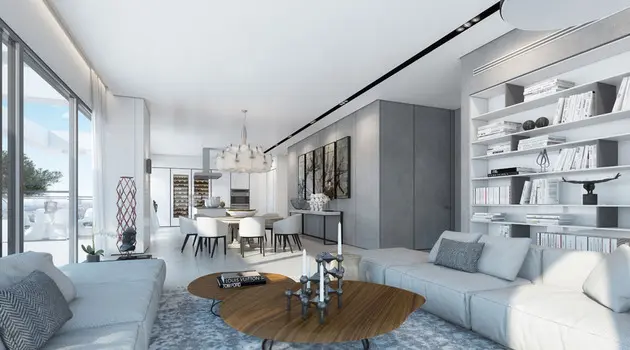Livingul formeaza un open space cu diningul si bucataria. In timp ce zona de odihna este destul de liniara, sparta usor de masuta de cafea cu forma neregulata (de altfel si singurul strop de culoare din incapere), diningul are o personalitate mai puternica, data de sculpturile care il decoreaza si de tablourile de pe perete. Un accent foarte frumos este candelabrul modern suspendat deasupra mesei. Imediat dupa dining ne intalnim cu bar cu cinci locuri de la care privelistea pur si simplu iti taie rasuflarea.