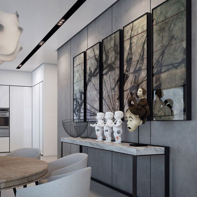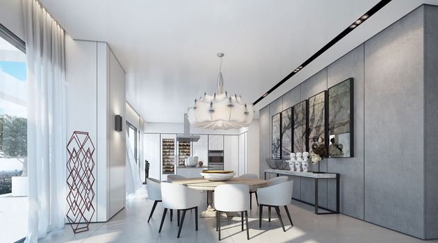 Livingul formeaza un open space cu diningul si bucataria. In timp ce zona de odihna este destul de liniara, sparta usor de masuta de cafea cu forma neregulata (de altfel si singurul strop de culoare din incapere), diningul are o personalitate mai puternica, data de sculpturile care il decoreaza si de tablourile de pe perete. Un accent foarte frumos este candelabrul modern suspendat deasupra mesei. Imediat dupa dining ne intalnim cu bar cu cinci locuri de la care privelistea pur si simplu iti taie rasuflarea.