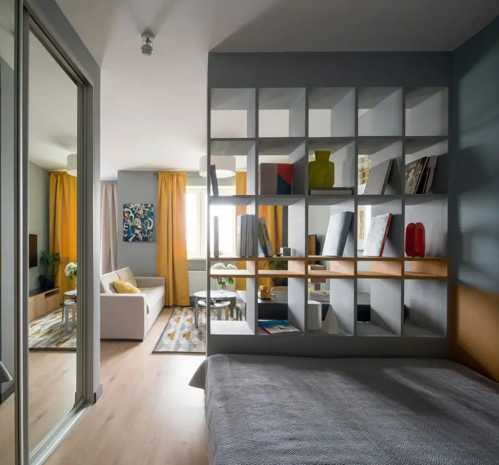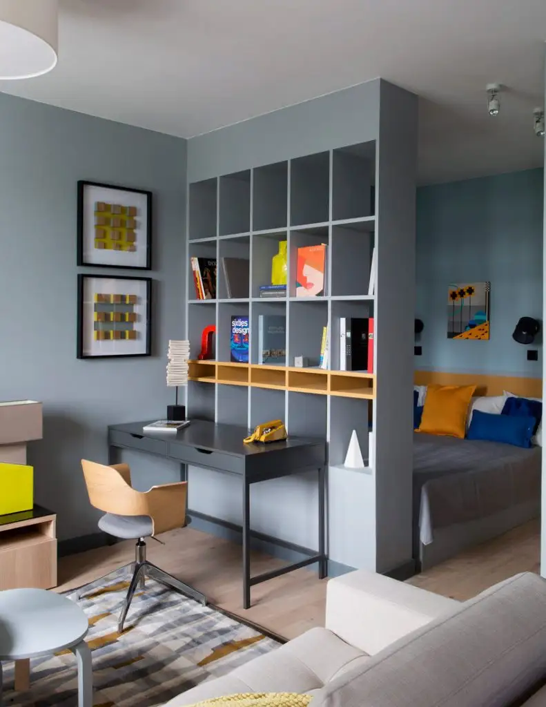 Apartamentul este unul tip studio, cu o camera principala impartita in functiunile necesare unui locuit confortabil. Folosind o abordare creativa, designerii au reusit sa contureze si o zona de dormit. Au creat o partitie sub forma unui perete cu rafturi deschise delimitand astfel dormitorul de restul spatiului.