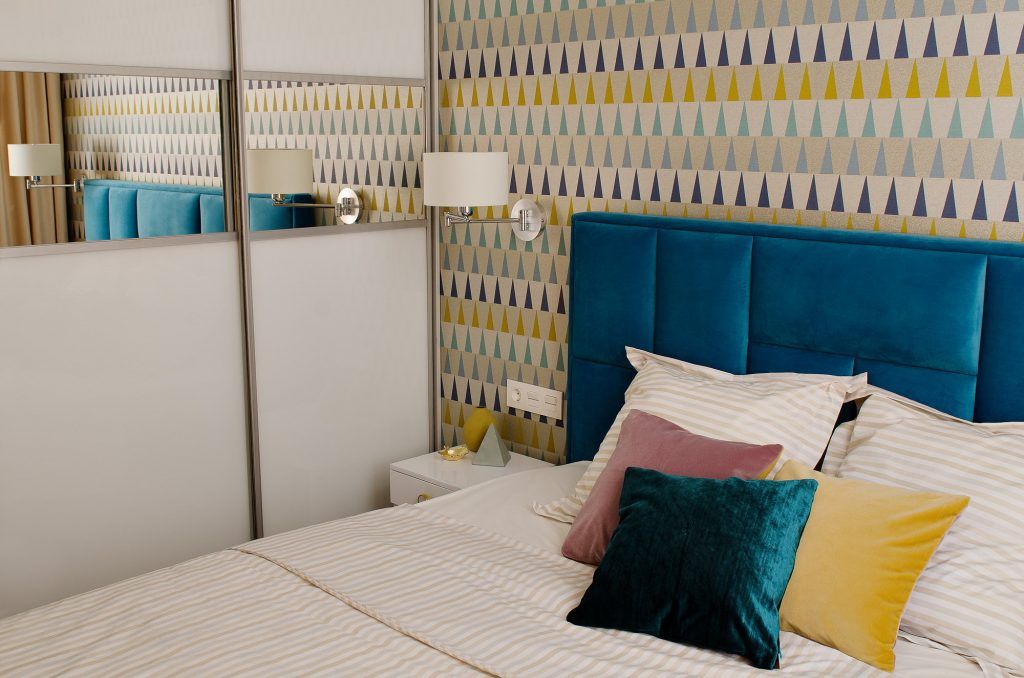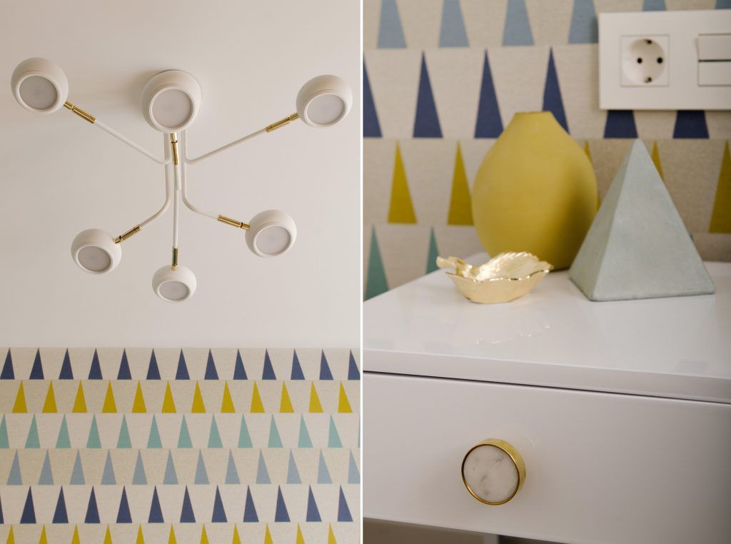 Dormitorul respinge banalitatea prin tapetul cu triunghiuri de mici dimensiuni care contrasteaza subtil cromatic intre ele si puternic cu tablia patului. Restul spatiului include mobilier de culoare alba, cu aspect lucios si un dulap care ocupa integral peretele pentru a acoperi si aspectul functional necesar dormitorului.