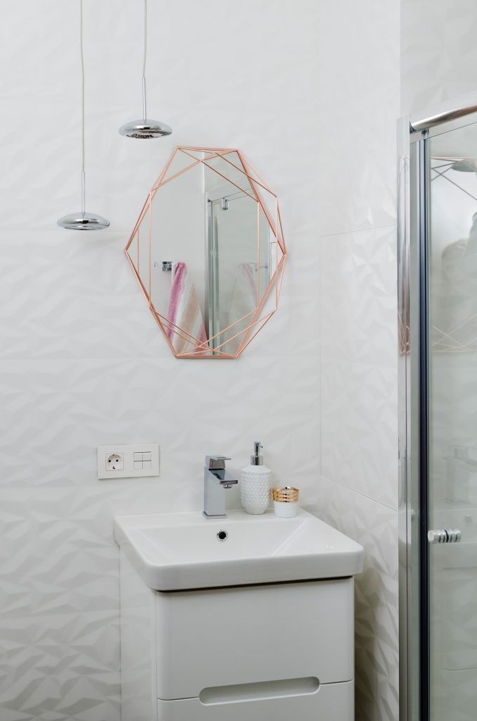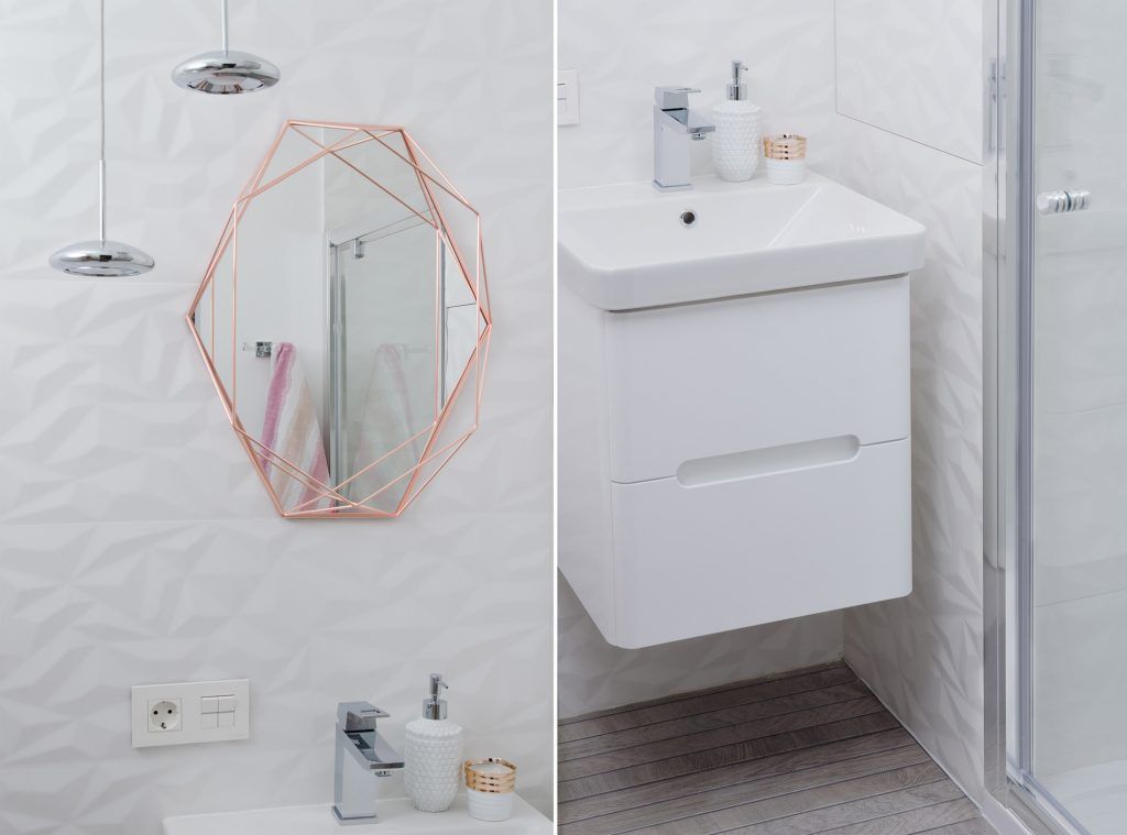 Oglinda cu accente specific moderne este elementul central in baie. Placile de faianta cu motive dispuse in relief transforma aceasta baie intr-una plina de originalitate.