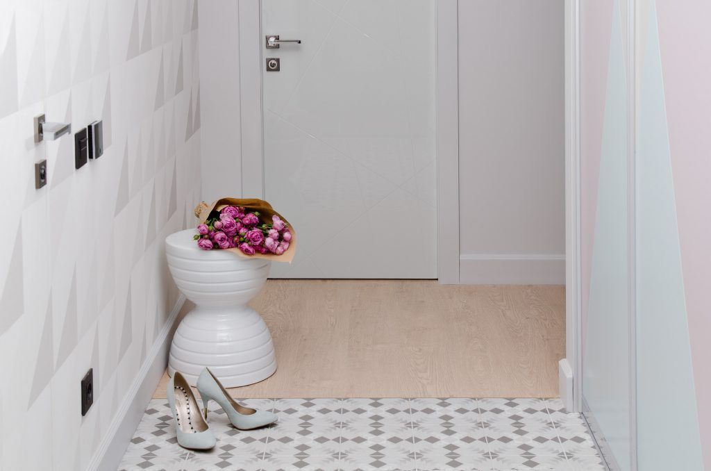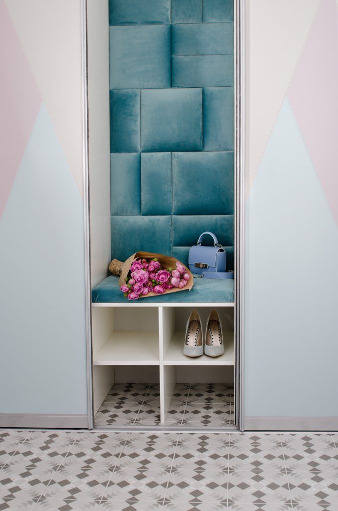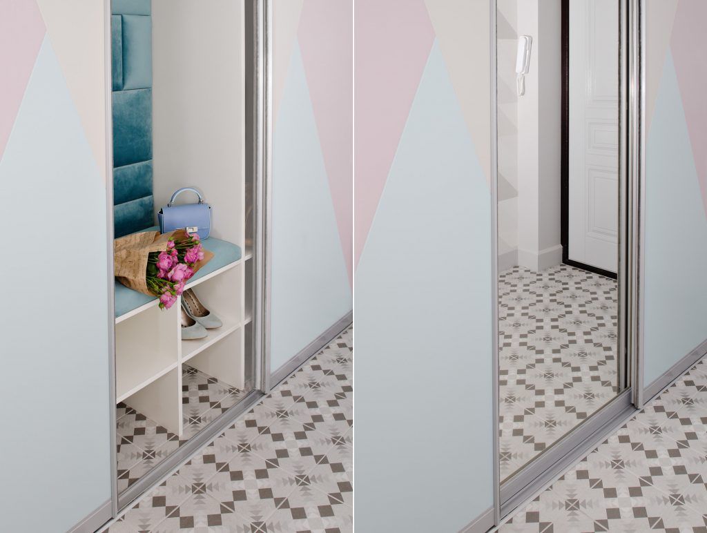 Holul ascunde in spatele usilor si al oglinzii montate pe sina un elegant spatiu pentru depozitarea pantofilor dotat cu o banca si completat de tapiseria turcoaz care inspira energie si confort. Aici, pe fiecare perete exista un model geometric dispus diferit, parchetul imparte spatiul holului cu gresia, iar toate aceste elemente stimuleaza creativitatea si ofera buna dispozitie.