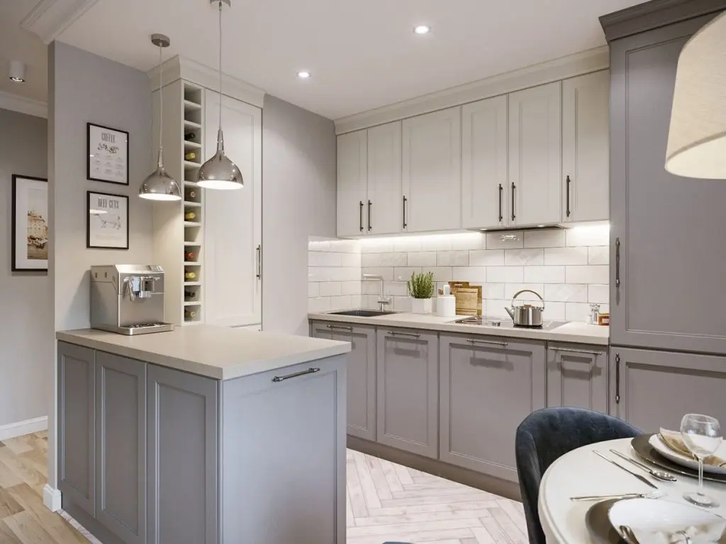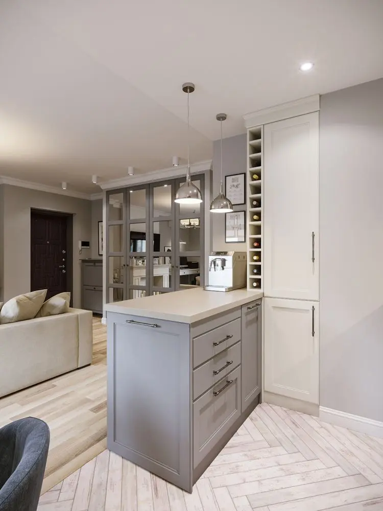 Tinand cont de deschiderea bucatariei spre camera, amenajarea a mizat pe o dispunere compacta, cu electrocasnice incorporate pentru a pastra un aspect unitar si ordonat. Mobilierul frezat preia motivul stilului clasic pe care il vom gasi abordat in fiecare incapere. Pentru a avea mai mult spatiu de lucru, a fost creat un corp tip insula de bucatarie, extensibil, care asigura astfel mai mult loc pe blat, atat de necesar cand se gateste, dar si spatii suplimentare pentru depozitare.