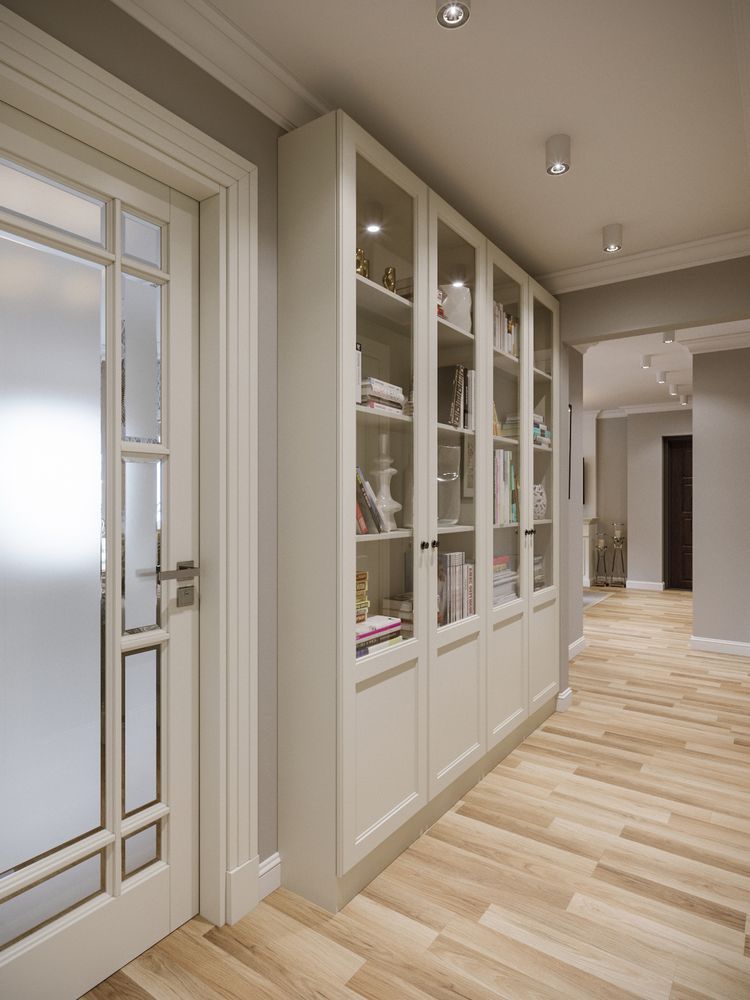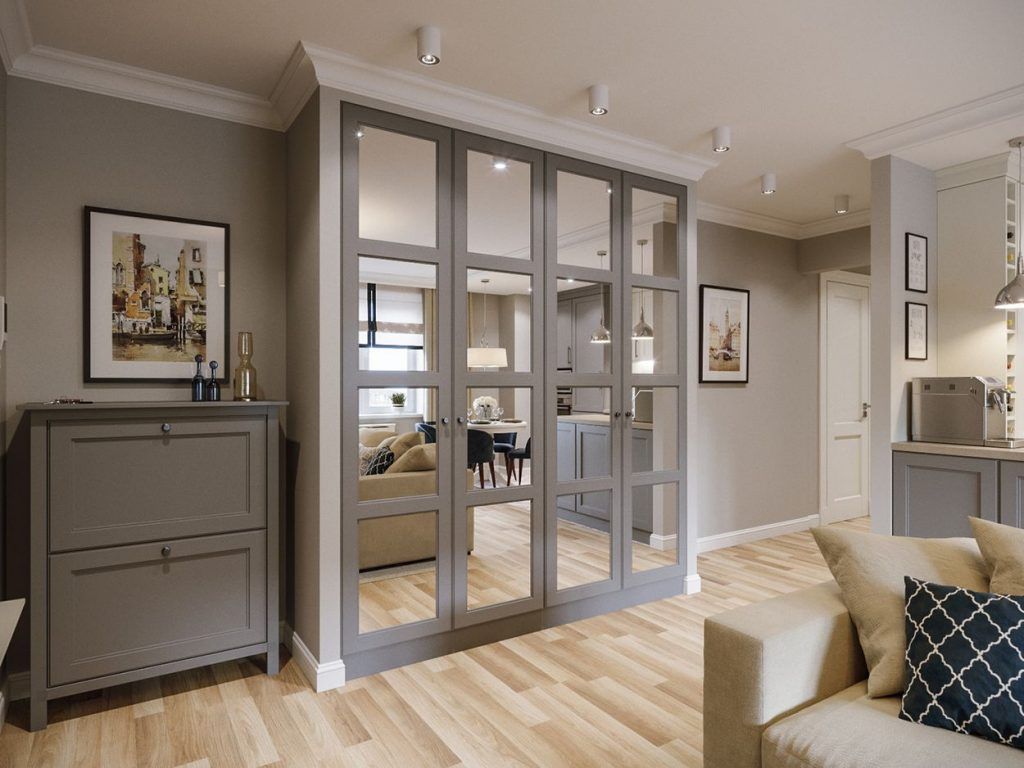 Intrucat accesul in locuinta se face practic direct in camera de zi, a fost gandita o zona mica care sa aminteasca de spatiul unui hol; imediat langa usa de la intrare se afla un pantofar si intr-o nisa special creata au fost incastrate doua dulapuri cu fatete din oglinzi. Ideea este excelenta pentru a crea iluzia de spatialitate si un plus de lumina.