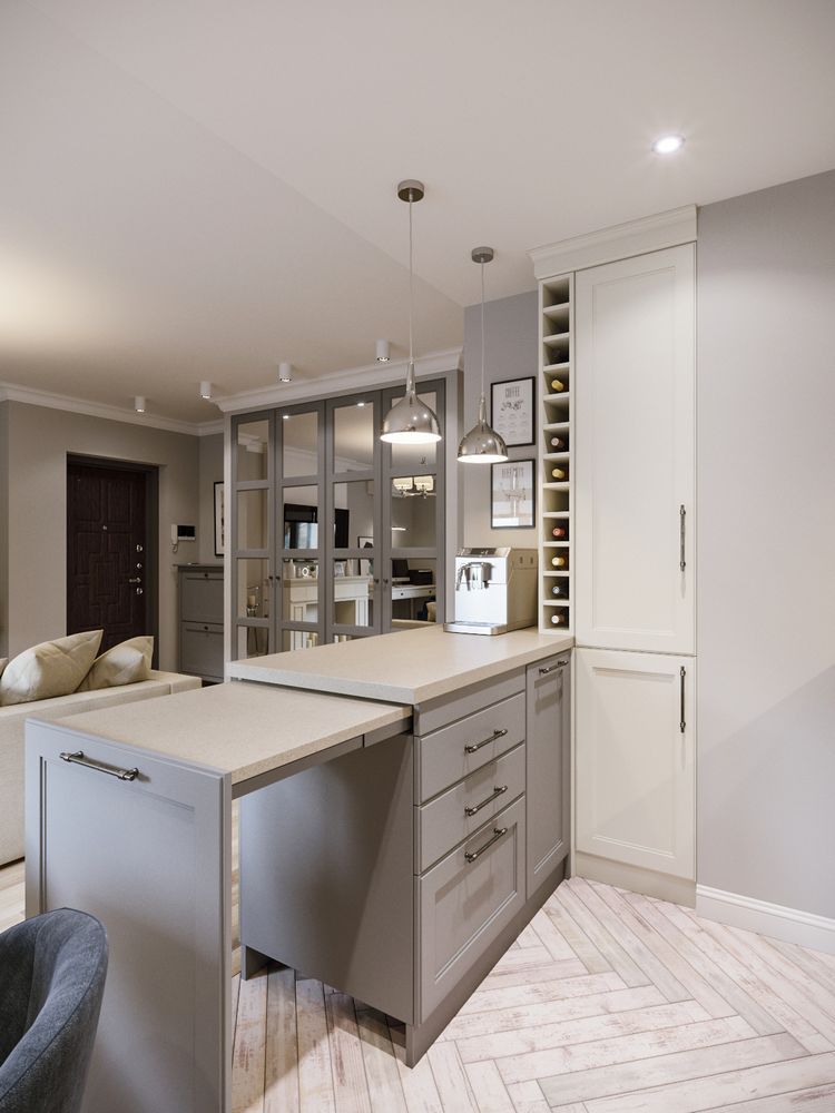 Tinand cont de deschiderea bucatariei spre camera, amenajarea a mizat pe o dispunere compacta, cu electrocasnice incorporate pentru a pastra un aspect unitar si ordonat. Mobilierul frezat preia motivul stilului clasic pe care il vom gasi abordat in fiecare incapere. Pentru a avea mai mult spatiu de lucru, a fost creat un corp tip insula de bucatarie, extensibil, care asigura astfel mai mult loc pe blat, atat de necesar cand se gateste, dar si spatii suplimentare pentru depozitare.