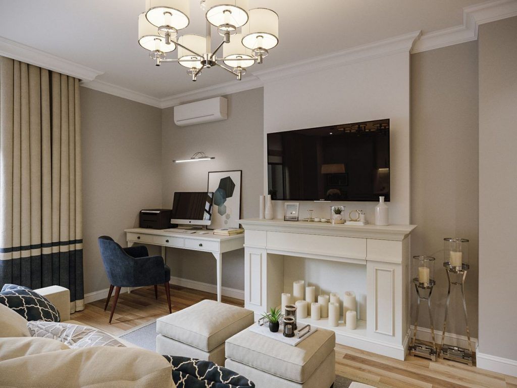 Prin pozitionarea canapelei in centrul camerei s-a reusit o delimitare vizuala a functiunilor. In locul unei masute de cafea, s-a optat pentru doua otomane ce pot fi folosite si ca loc pentru sezut. Semineul fals precum si televizorul de deasupra lui creeaza o zona de interes in spatiul destinat livingului. Tot aici, a fost gandita si o zona de birou.