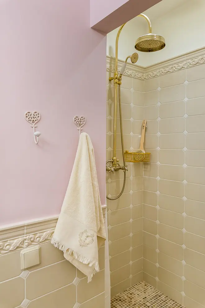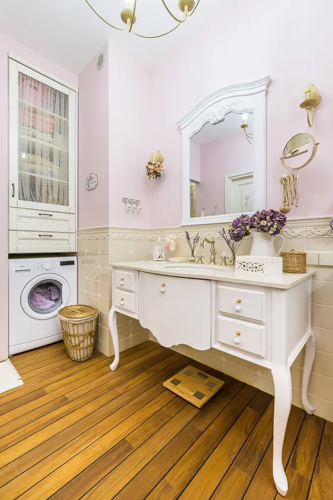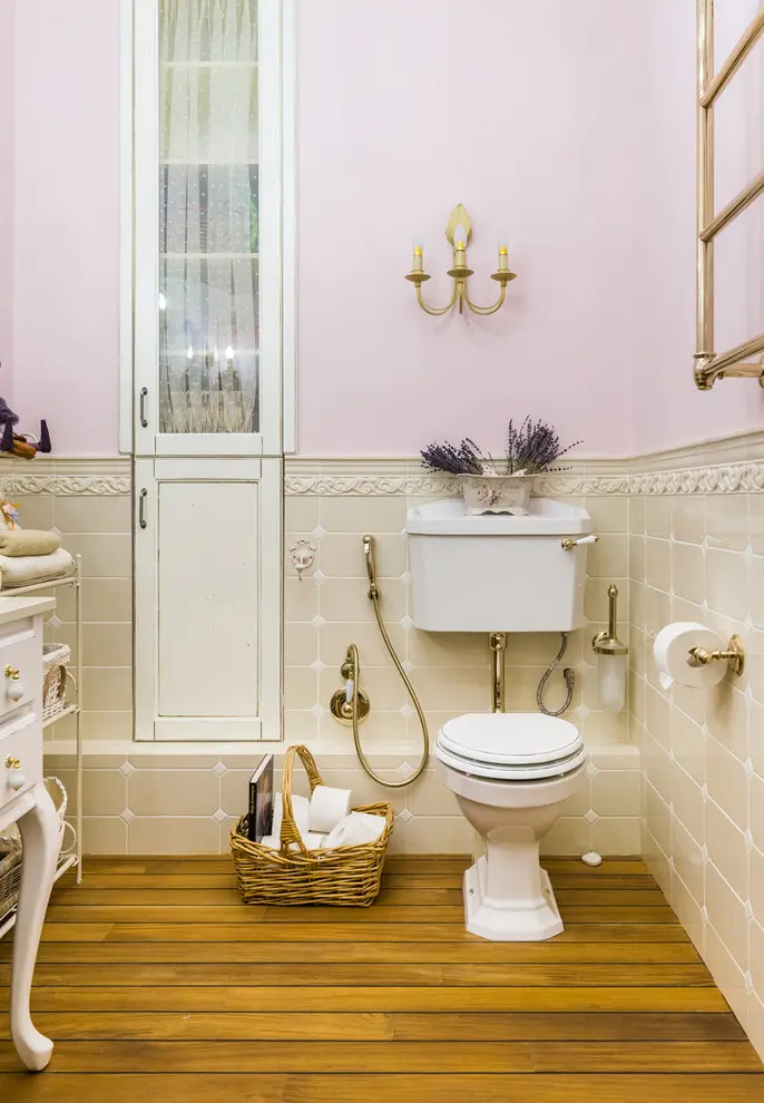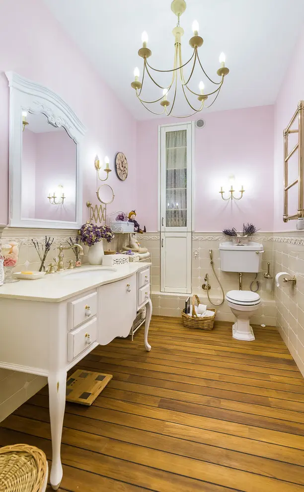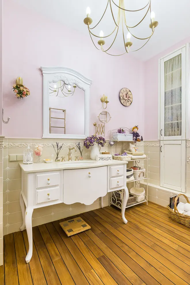 Baia face o calatorie brusca in timp si duce principala idee a influentelor medievale catre un nivel ridicat. Mobilierul si componentele sanitare vin cu un design retro si culori specifice precum auriul care, se imbina perfect cu lemnul din structura pardoselii. Accesoriile sunt nenumarate: buchetele de flori pastelate, ceas de perete, plusuri si diverse cutii pentru depozitare.