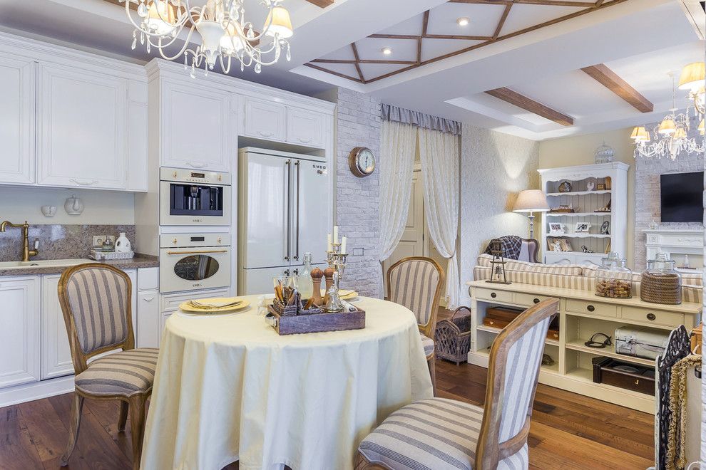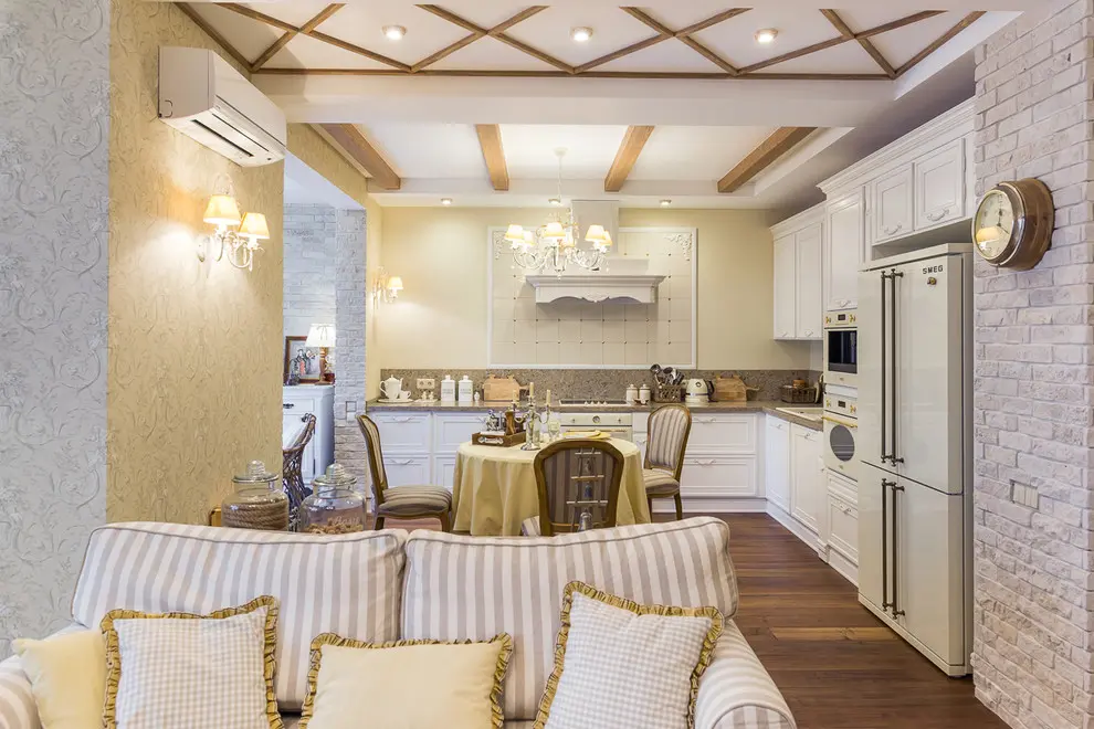 Zona bucatariei vine in continuarea living-ului pastrand aceeasi tematica in cazul mobilierului care o compune, designul acestuia fiind scos si mai mult in evidenta de aspectul vintage al electrocasnicelor incorporate. In ceea ce priveste tavanul acestui open space, grinzile de lemn nu fac altceva decat sa contureze iluzia unei vile clasice dintr-un spatiu temporal trecut.
