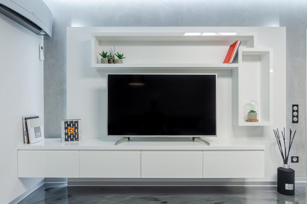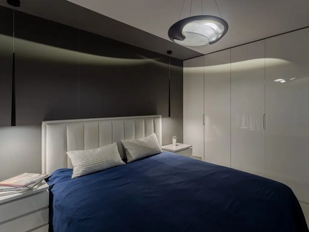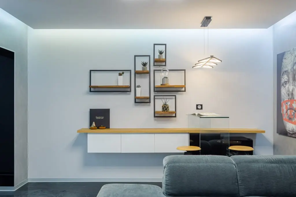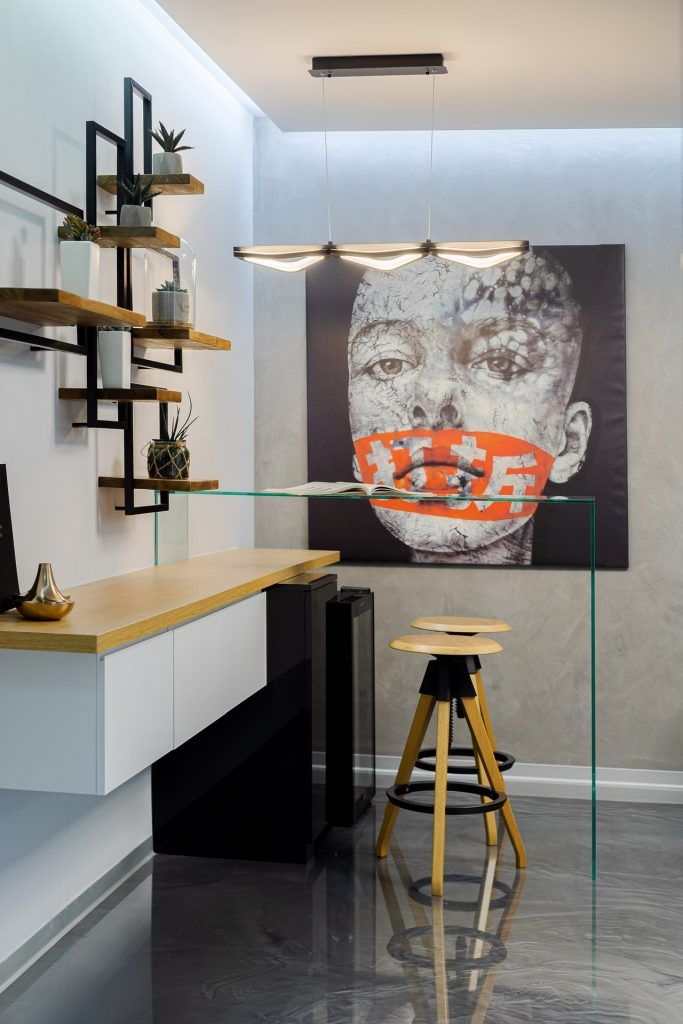 Conceptul amenajarii este unul unitar, intreaga locuinta pastreaza aceeasi linie stilistica. Livingul a fost amenajat minimalist, dar totul este de impact: barul modern din sticla, frigiderul de vinuri, mobilierul suspendat realizat la comanda, scafa perimetrala iluminata cu benzi de Led culoare rece.