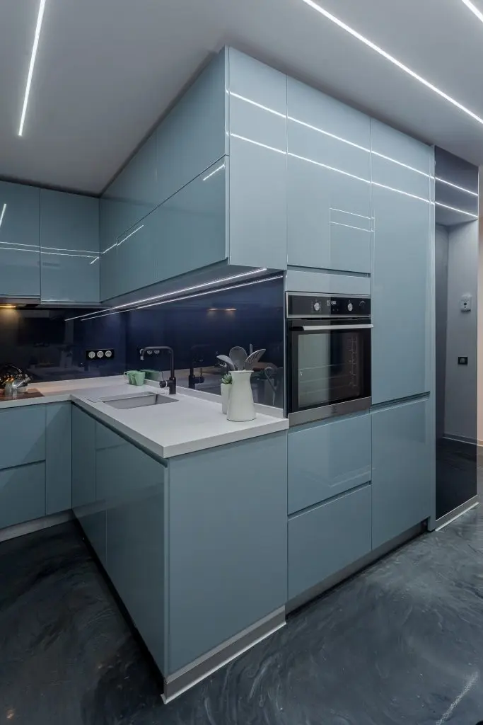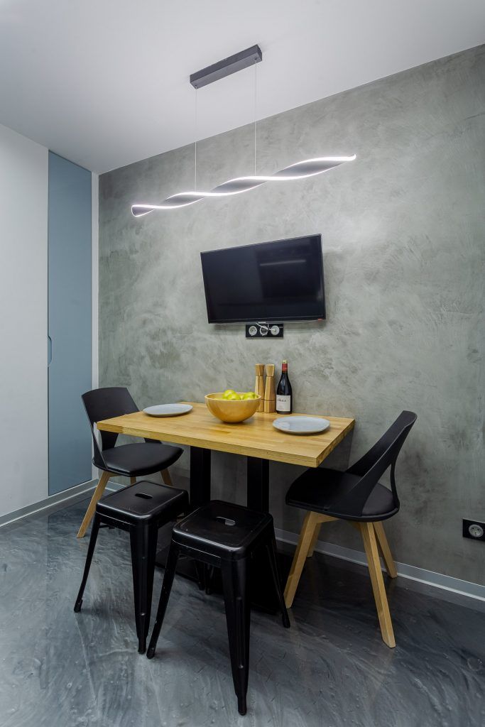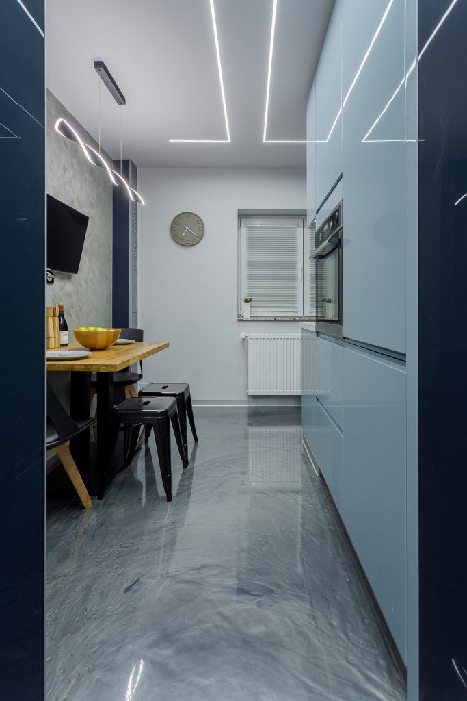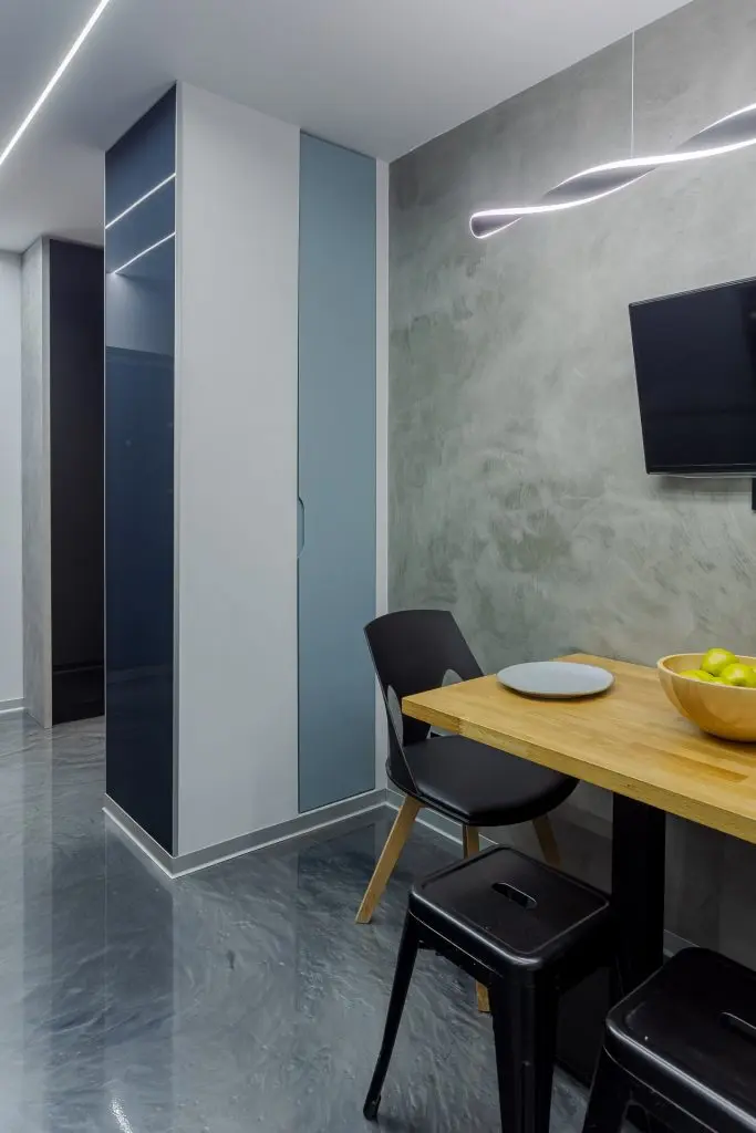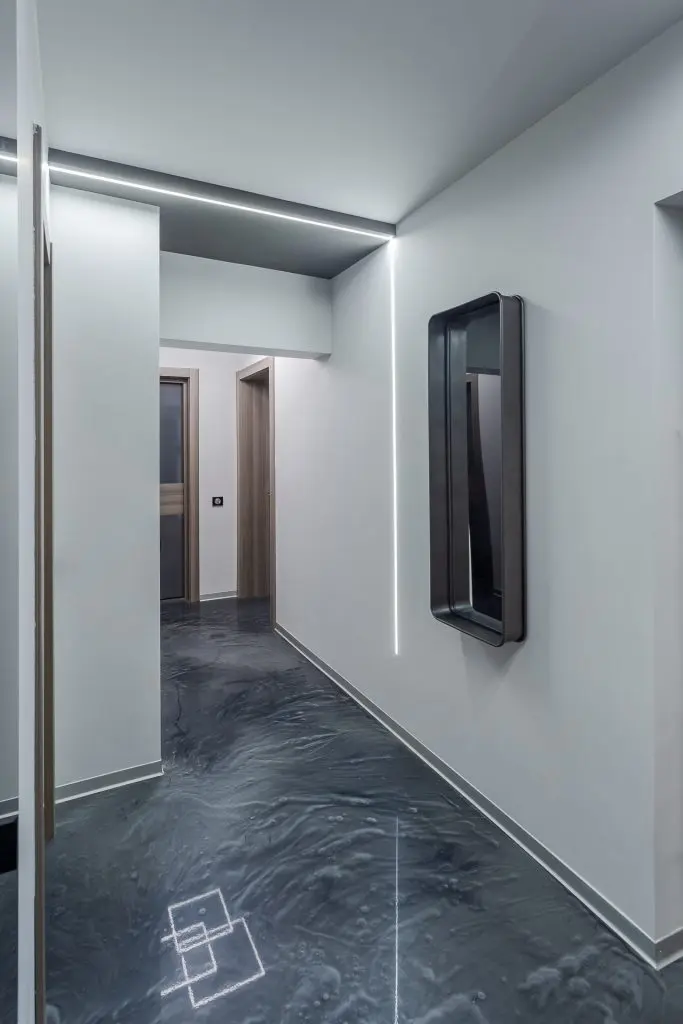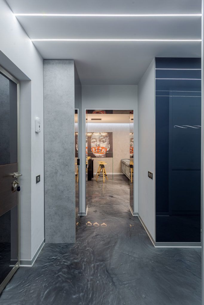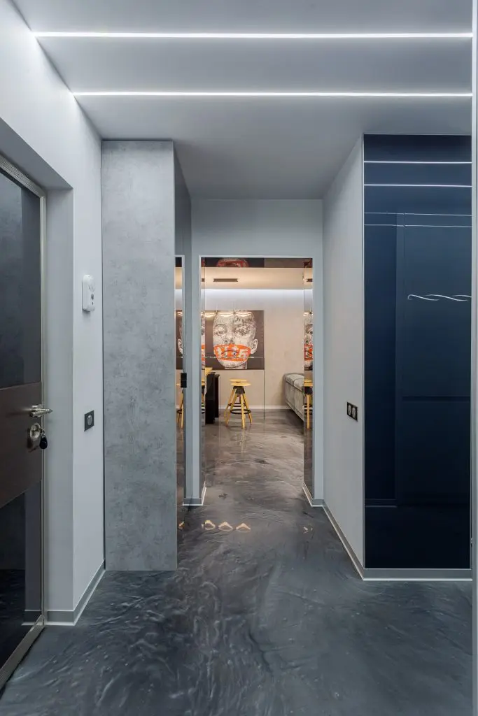 Finisajele alese pentru pereti si pardoseala maresc vizual spatiul prin reflexiile create si contribuie la conturarea atmosferei moderne. Placarea cu sticla neagra adauga un plus de eleganta locuintei; pardoseala din rasina epoxidica cu praf argintiu creaza o continuitate armonioasa in intreaga locuinta, plinta de aluminiu intr-o nuanta gri face parte din paleta cromatica aleasa. Datorita suprafetelor lucioase, lumina se multiplica si spatiul pare mai mare.