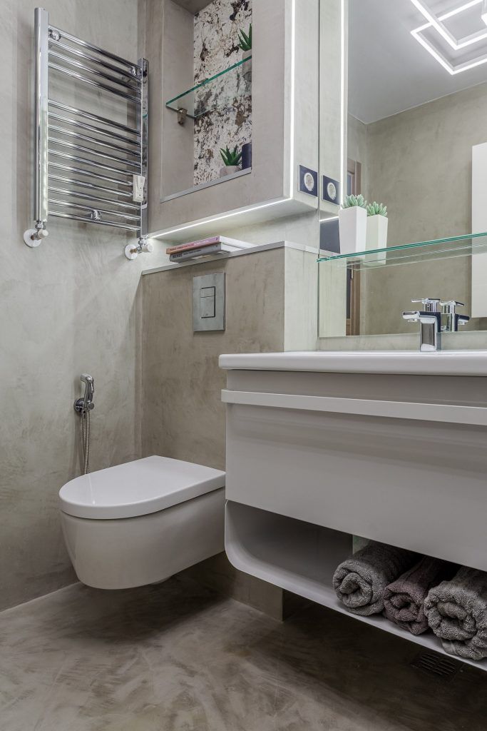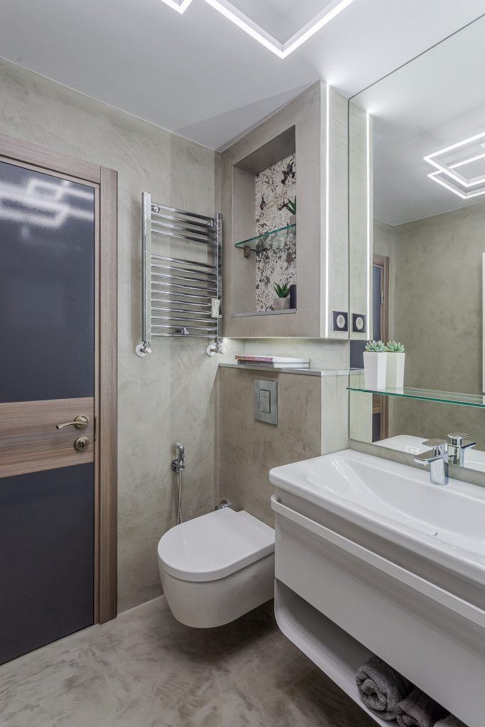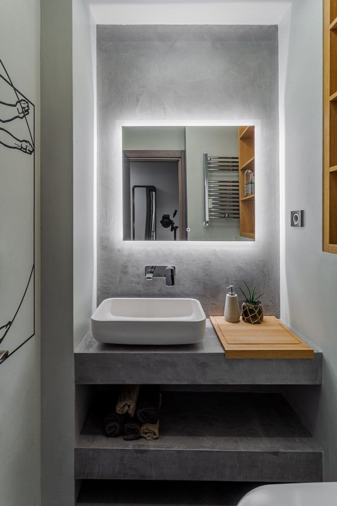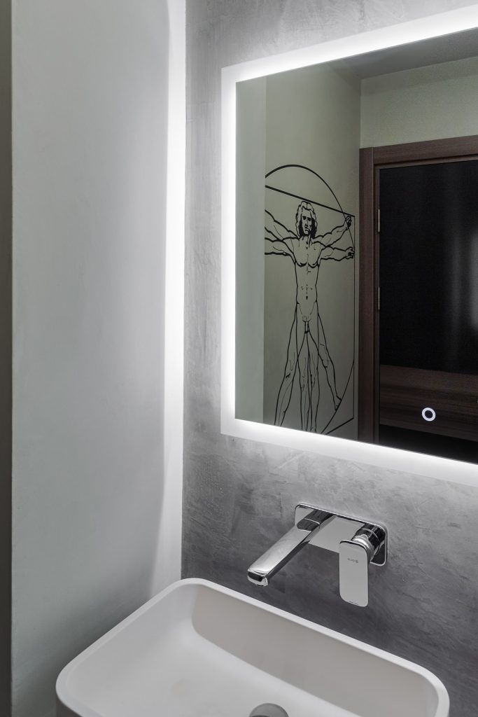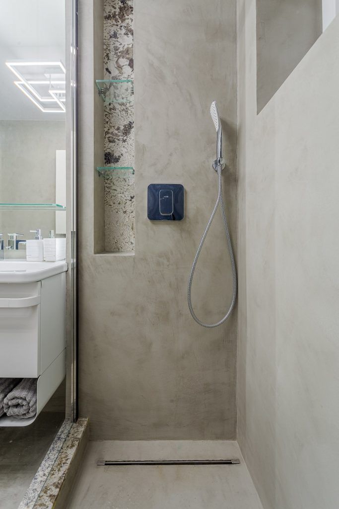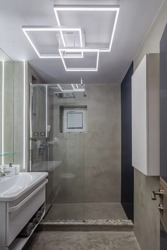 “Microcimentul inlocuieste cu succes placutele ceramice, dusul, blatul de chiuveta si alte suprafete expuse la apa fiind perfect izolate.” O mare atentie a fost acordata iluminatului, cu benzi led incastrate in pereti, reflexii ale acestora in oglinzi si in placarile de sticla vopsita.