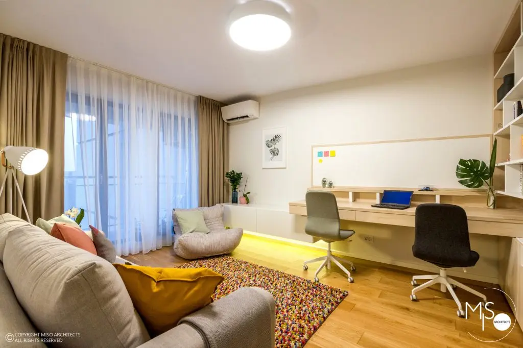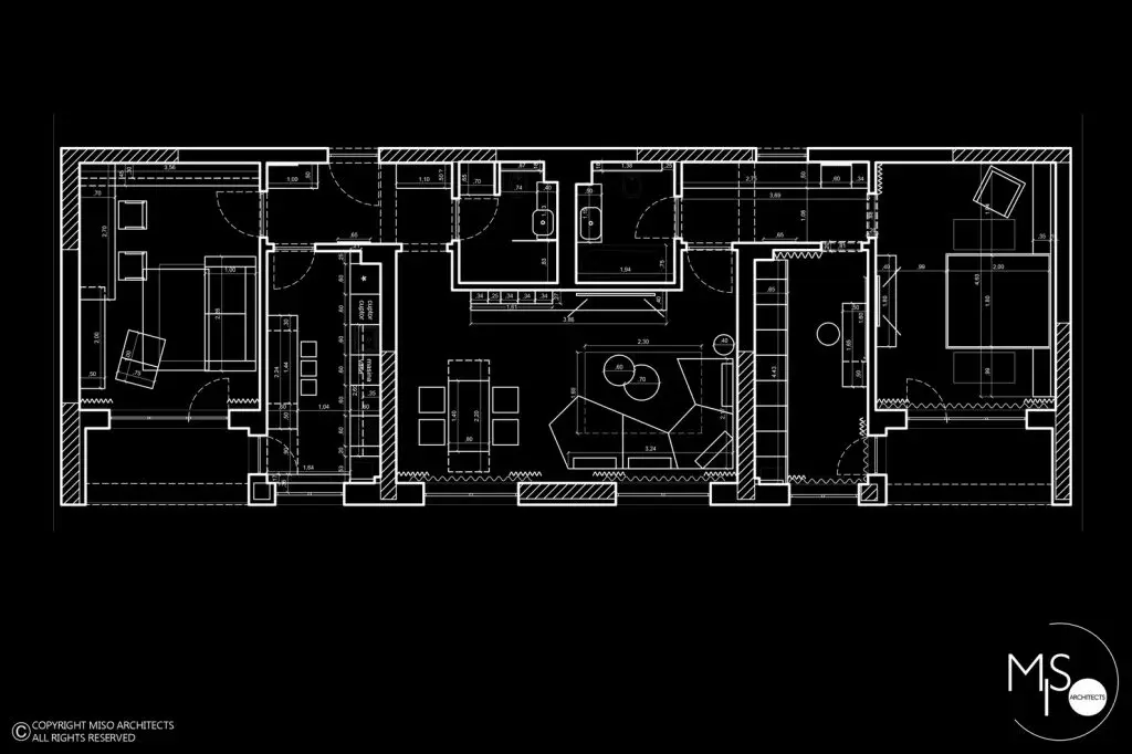 Cu un spatiu extrem de generos, de aproximativ 102 metri patrati, aceasta locuinta isi propune ca, prin transformarea majora realizata de catre specialistii Miso Arhitects, sa respecte atat cerintele tinerilor beneficiari, cat si detaliile fascinante ale amenajarilor actuale.