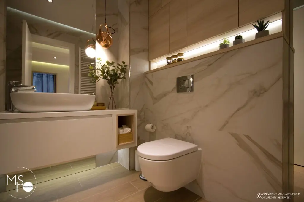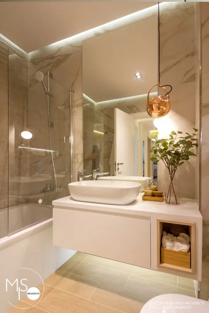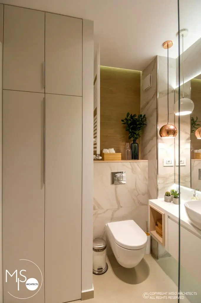 Cele doua bai care intra in componenta apartamentului, adauga amenajarii un plus de eleganta si rafinament prin adoptarea unui stil simplu compus din materiale ceramice care imita fidel marmura si oglinzi. Vorbim in acest caz de componente sanitare cu aspect modern, spatii de depozitare numeroase, accesorii naturale si accente de roz auriu evidentiate de elementele de iluminat artificial.