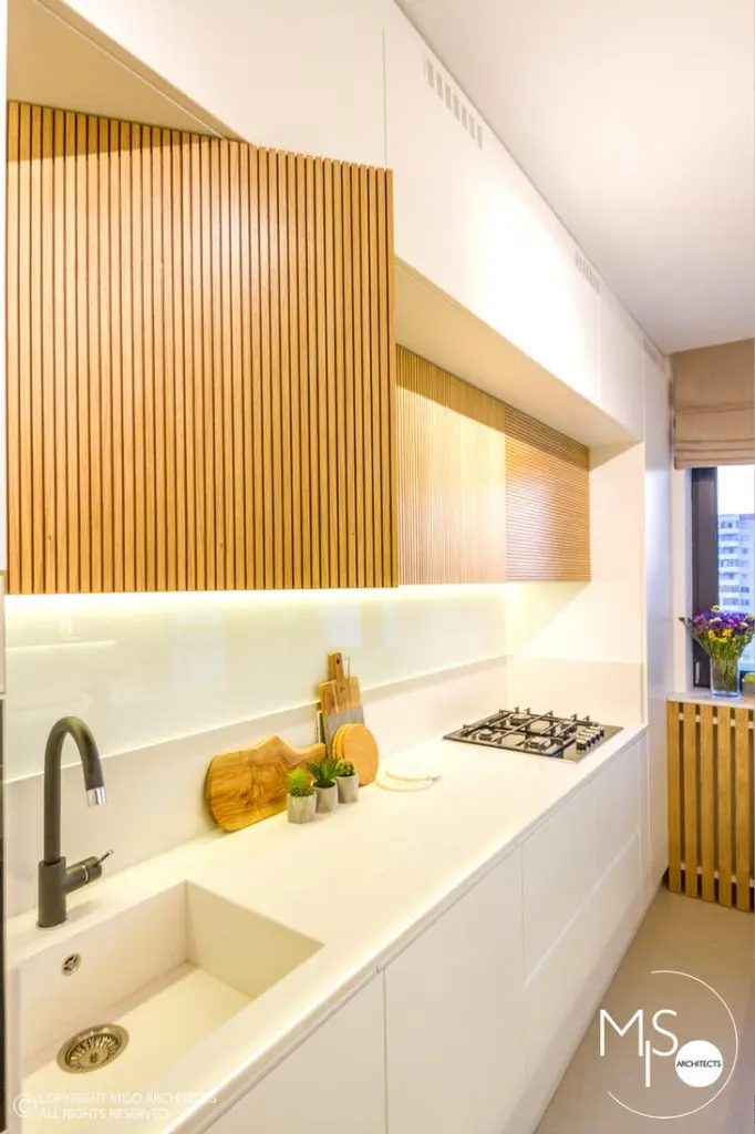 Bucataria pe lung, se organizeaza functional, devenind spatiul potrivit pentru pregatirea mesei. Din punct de vedere estetic, albul imaculat impreuna cu lemnul ofera naturalete si prospetime intregii camere.