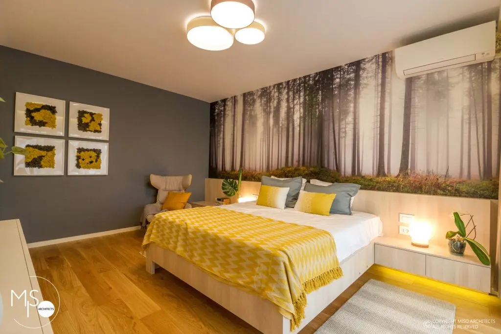 Dormitorul matrimonial transpune actiunea intr-un spatiu de poveste evidentiat cu ajutorul iluziei tapetului folosit. Si aici, componentele care se fac evidentiate sunt cu seama, elementele de iluminat artificial si cele cromatice. Intr-o maniera unitara, dormitorul se continua catre zona dressing-ului si a baii cu un hol pe lung, organizat functional din punct de vedere estetic, cu spatii de depozitare si relaxare.