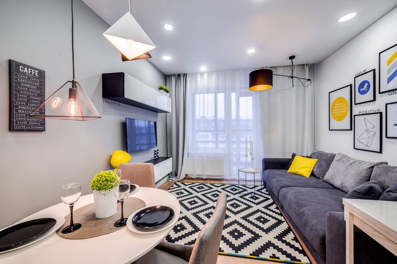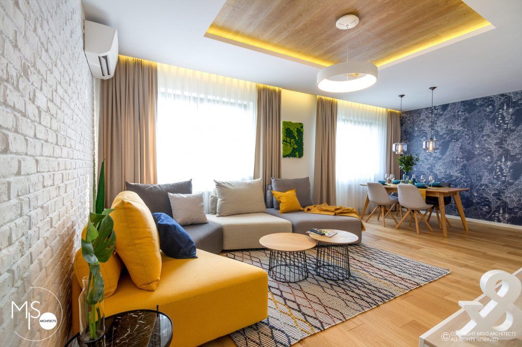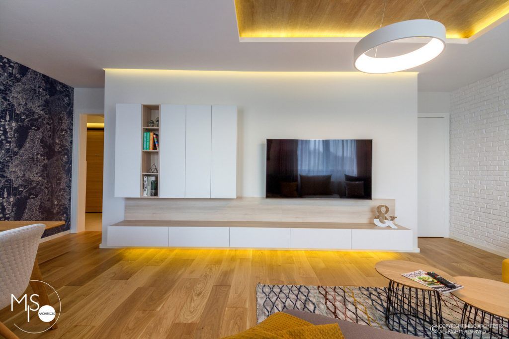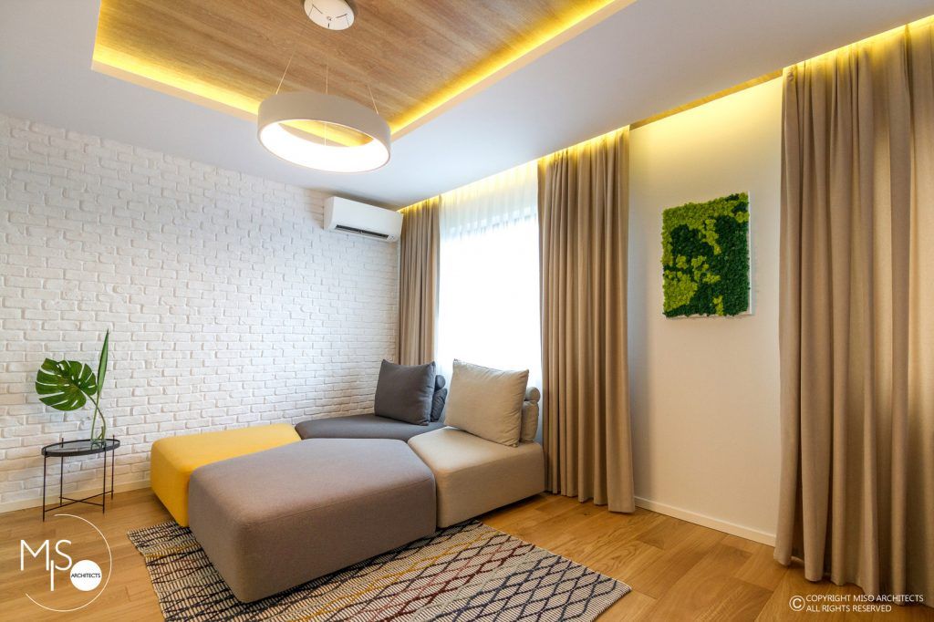 Impartit subtil in doua zone: una de relaxare si cealalta de socializare si servire a mesei, intregul living se compune din elemente ultra moderne, cu aspect futurist si abstract, pornind de la componentele de mobilier si finalizand cu benzile de led prezente intr-un procent destul de mare, ce au ca scop obtinerea unei atmosfere calde, intime si relaxante. Canapeaua cu caracter modular este cea care atrage atentia in mare masura, aceasta fiind compusa din mai multe elemente care, organizate diferit, au ca rezultat un nou corp de mobilier. Elementele naturale predominante se compun din lemn natural, bumbac, in si furnir si vin intr-o armonie completa cu paleta cromatica bazata pe nuante calde si vesele.