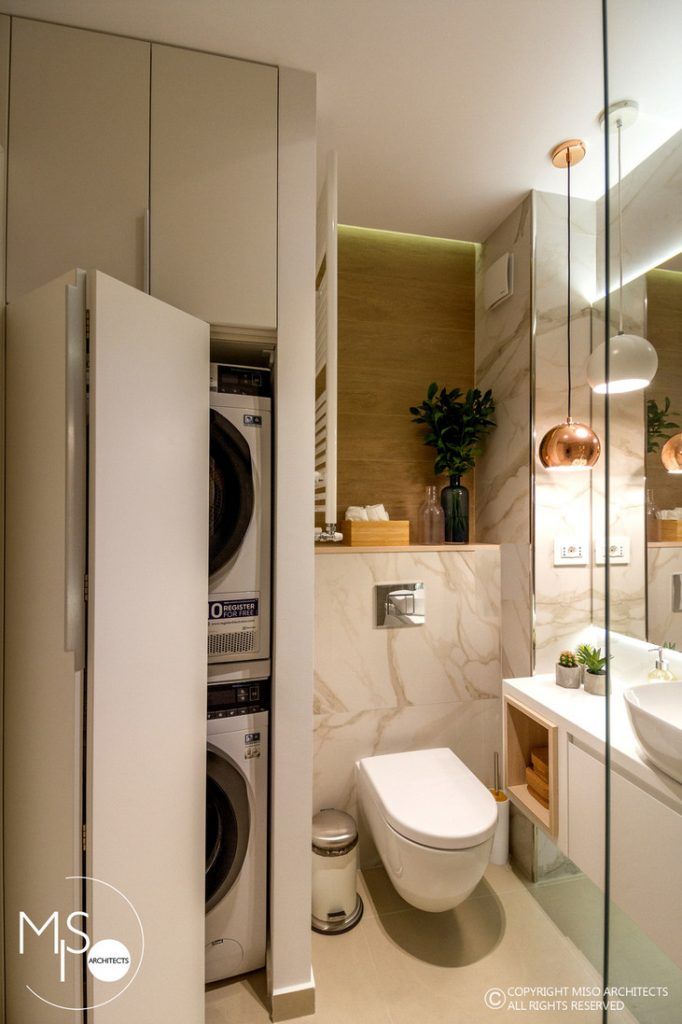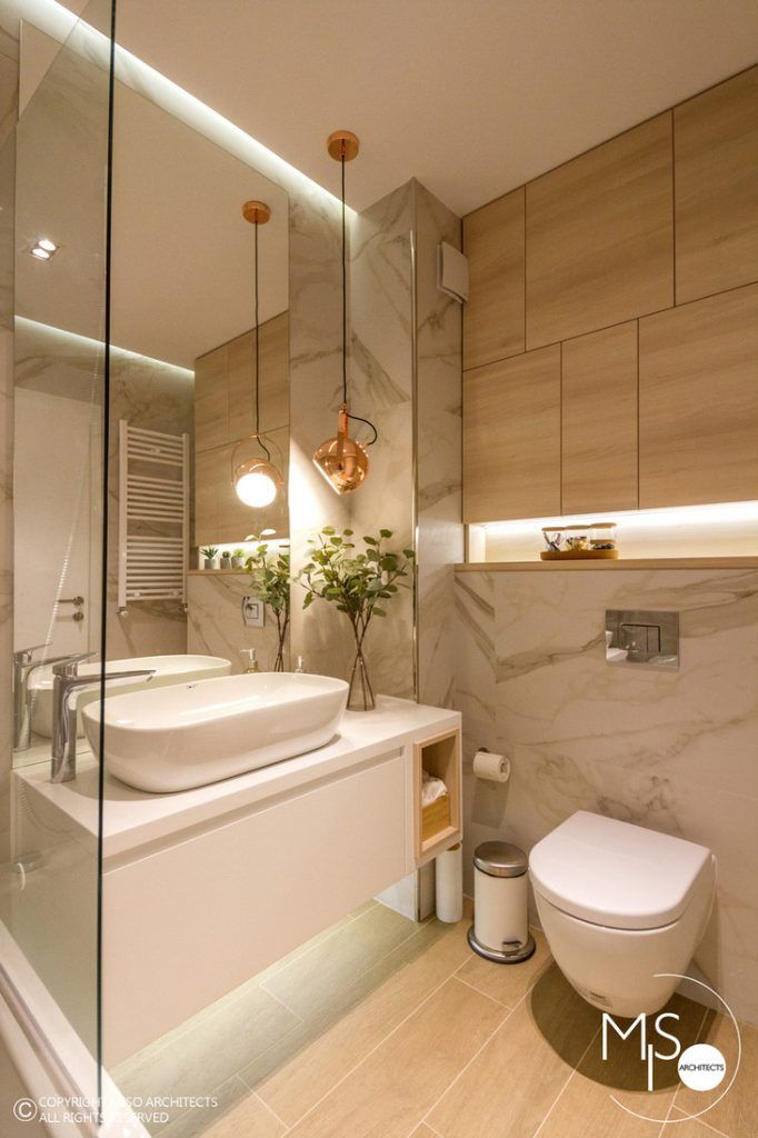 Cele doua bai care intra in componenta apartamentului, adauga amenajarii un plus de eleganta si rafinament prin adoptarea unui stil simplu compus din materiale ceramice care imita fidel marmura si oglinzi. Vorbim in acest caz de componente sanitare cu aspect modern, spatii de depozitare numeroase, accesorii naturale si accente de roz auriu evidentiate de elementele de iluminat artificial.