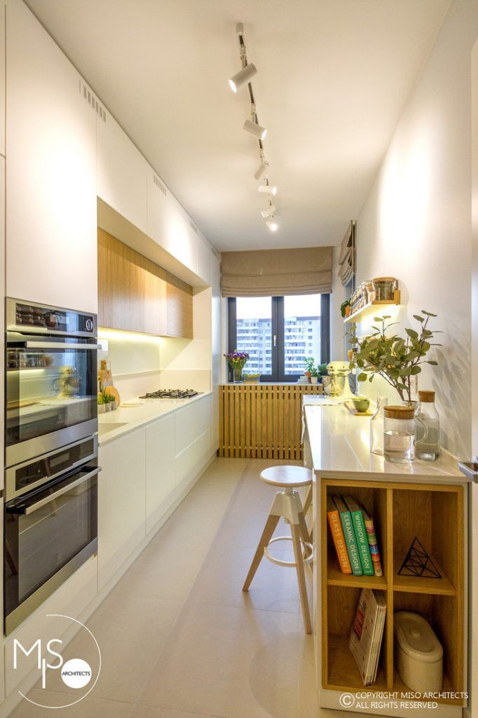 Bucataria pe lung, se organizeaza functional, devenind spatiul potrivit pentru pregatirea mesei. Din punct de vedere estetic, albul imaculat impreuna cu lemnul ofera naturalete si prospetime intregii camere.