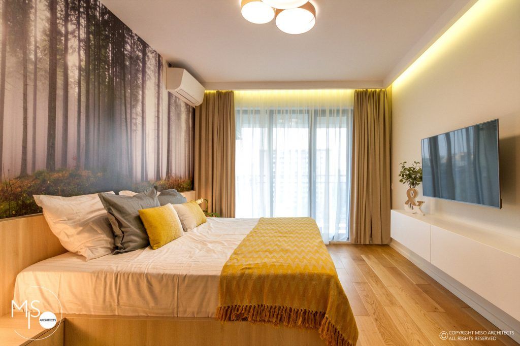 Dormitorul matrimonial transpune actiunea intr-un spatiu de poveste evidentiat cu ajutorul iluziei tapetului folosit. Si aici, componentele care se fac evidentiate sunt cu seama, elementele de iluminat artificial si cele cromatice. Intr-o maniera unitara, dormitorul se continua catre zona dressing-ului si a baii cu un hol pe lung, organizat functional din punct de vedere estetic, cu spatii de depozitare si relaxare.