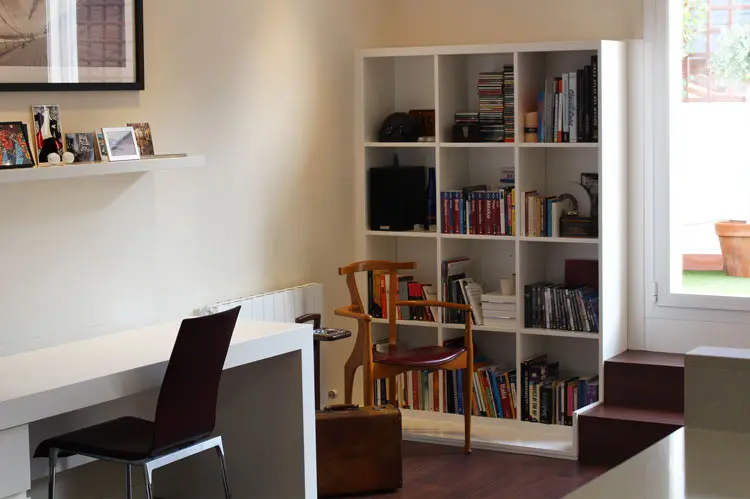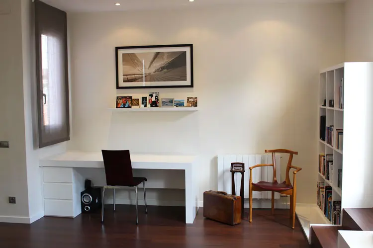 Mobilierul ales este alb, cu front lucios pentru a reflecta lumina si a crea impresia de spatialitate. De remarcat ca nu s-a optat pentru piese voluminoase, ci mai degraba de dimensiuni reduse, de tipul etajerelor, comodelor sau biblioteca de inaltime medie. Interesanta alegere pentru culoarea parchetului, o nuanta mai inchisa care sa contrasteze cu albul. Pentru tot apartamentul s-a folosit acelasi tip de parchet, obtinand astfel un caracter unitar si coerent, in dorinta aceasta de a conecta functiunile intre ele.
