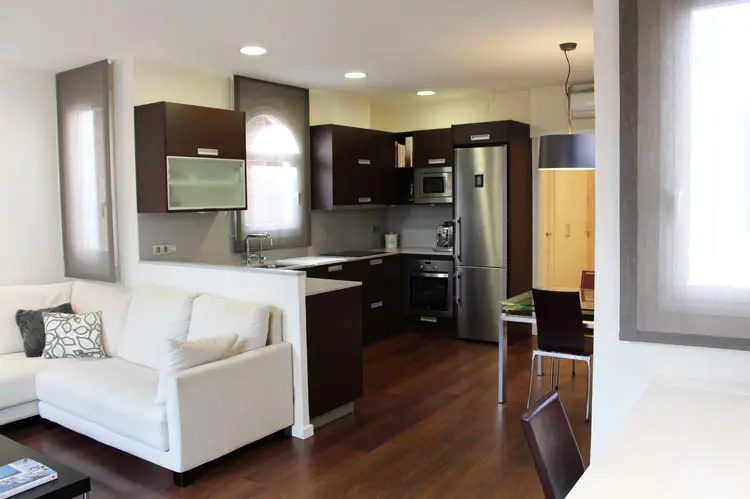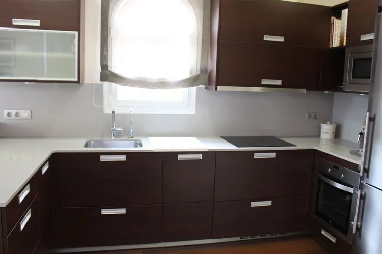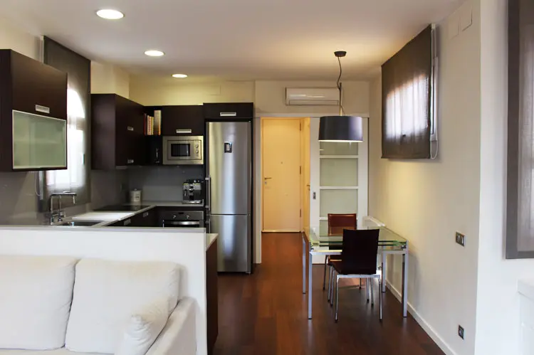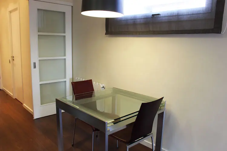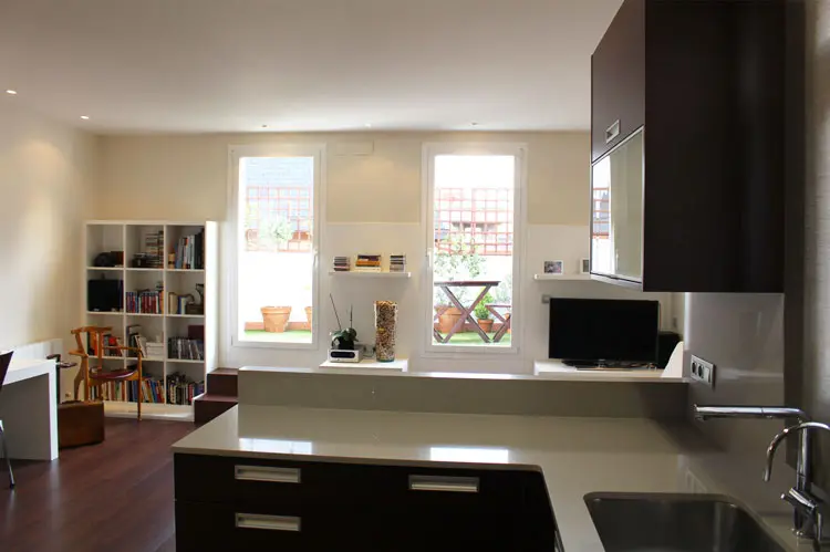 Unitatea cromatica se pastreaza si in zona bucatariei, mobilierul avand culori asemanatoare cu cele ale pardoselii. Nici aici corpurile nu sunt foarte mari, ci pastreaza proportiile camerei. Electrocasnice incastrate in mobilier, blat alb, lucios sunt piesele care compun aceasta amenajare. Fereastra in dreptul careia a fost instalata chiuveta ilumineaza natural aceasta zona. Si locul de luat masa beneficiaza de lumina naturala, iar corpul de iluminat de deasupra mesei pune in valoare acest sector al camerei.