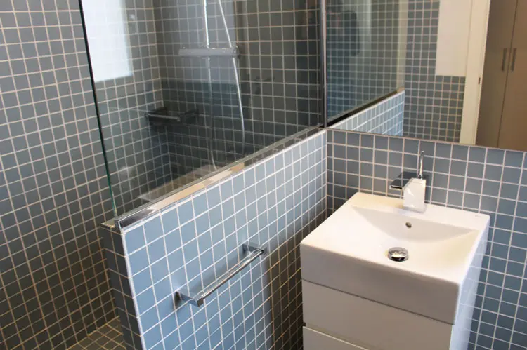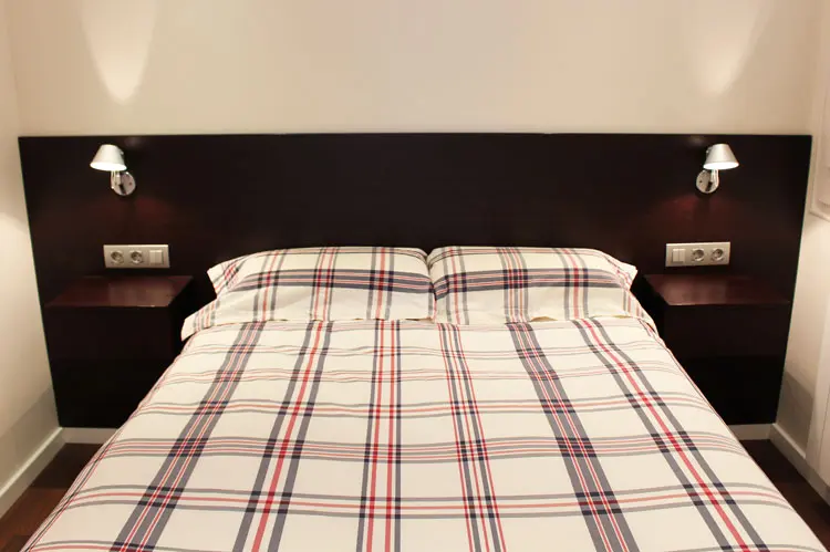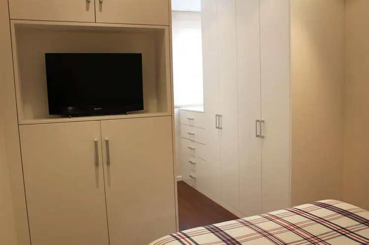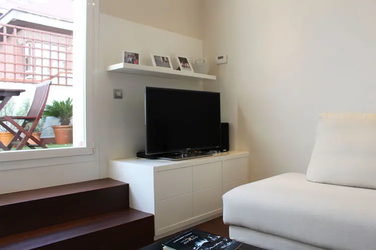 In dormitor s-a mers pe aceeasi linie a unui design functional, cu mobilier si pereti albi. Ne place ideea acelui dressing tip walk-in cu sertare si dulapuri de o parte si de cealalta a peretilor. Si baia este practica: dus cu scurgere in pardoseala si o nisa incastrata care adaposteste masina de spalat rufe si uscator automat.