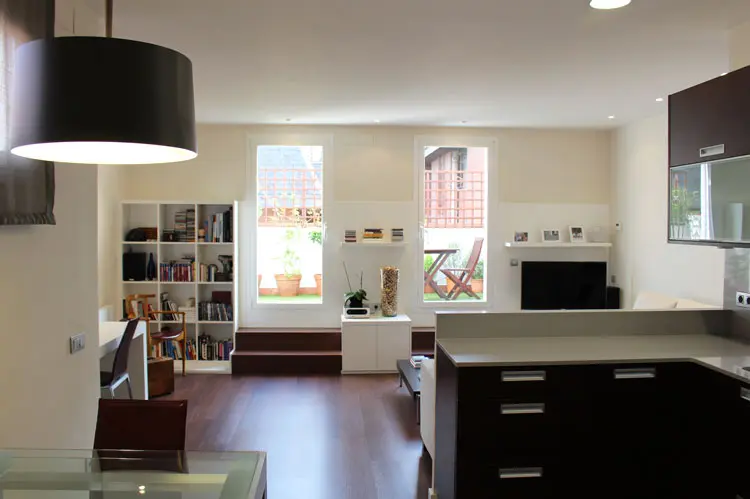 Pentru zona de zi, s-a obtinut un spatiu unitar, in care livingul comunica direct cu bucataria, dar separate vizual pentru a le pune in evidenta. Decorul minimalist face intreaga amenajare sa para aerisita. Cele 2 scari care conduc spre terasa, ajuta la o impartire oarecum intuitiva a livingului in mai multe subfunctiuni. Avem astfel o zona de conversatie cu canapea si televizor, pentru ca in celalalt capat sa mergem spre o biblioteca cu un colt de lectura si un birou.