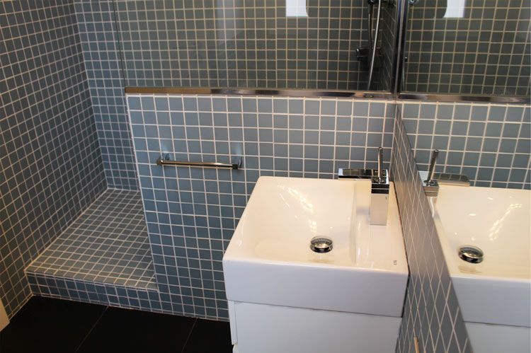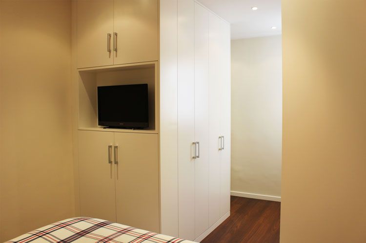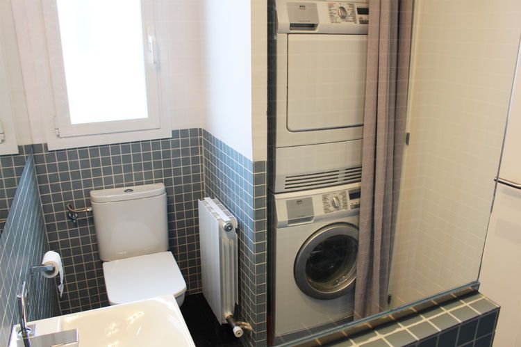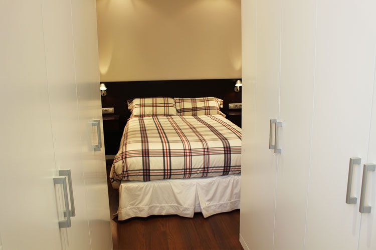 In dormitor s-a mers pe aceeasi linie a unui design functional, cu mobilier si pereti albi. Ne place ideea acelui dressing tip walk-in cu sertare si dulapuri de o parte si de cealalta a peretilor. Si baia este practica: dus cu scurgere in pardoseala si o nisa incastrata care adaposteste masina de spalat rufe si uscator automat.
