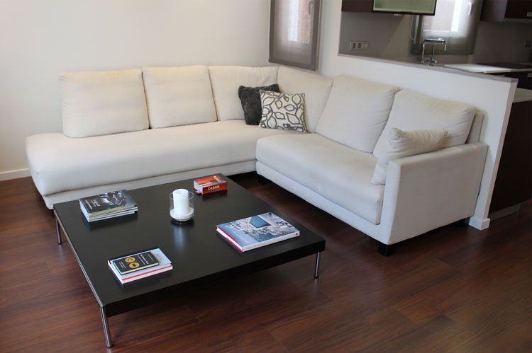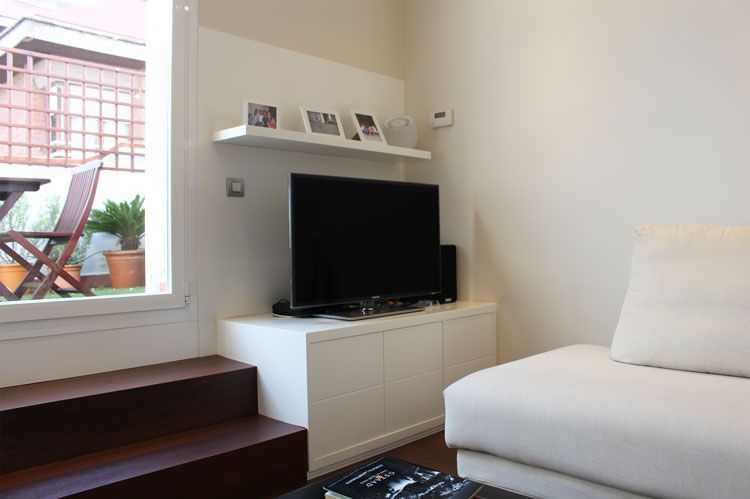 Mobilierul ales este alb, cu front lucios pentru a reflecta lumina si a crea impresia de spatialitate. De remarcat ca nu s-a optat pentru piese voluminoase, ci mai degraba de dimensiuni reduse, de tipul etajerelor, comodelor sau biblioteca de inaltime medie. Interesanta alegere pentru culoarea parchetului, o nuanta mai inchisa care sa contrasteze cu albul. Pentru tot apartamentul s-a folosit acelasi tip de parchet, obtinand astfel un caracter unitar si coerent, in dorinta aceasta de a conecta functiunile intre ele.