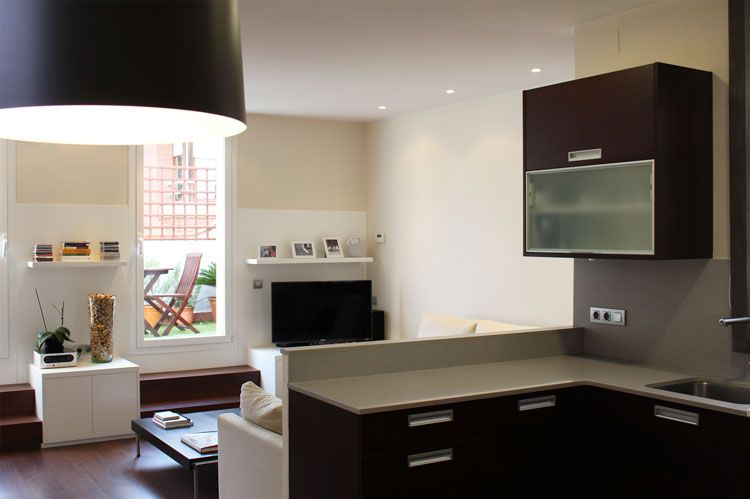 Unitatea cromatica se pastreaza si in zona bucatariei, mobilierul avand culori asemanatoare cu cele ale pardoselii. Nici aici corpurile nu sunt foarte mari, ci pastreaza proportiile camerei. Electrocasnice incastrate in mobilier, blat alb, lucios sunt piesele care compun aceasta amenajare. Fereastra in dreptul careia a fost instalata chiuveta ilumineaza natural aceasta zona. Si locul de luat masa beneficiaza de lumina naturala, iar corpul de iluminat de deasupra mesei pune in valoare acest sector al camerei.