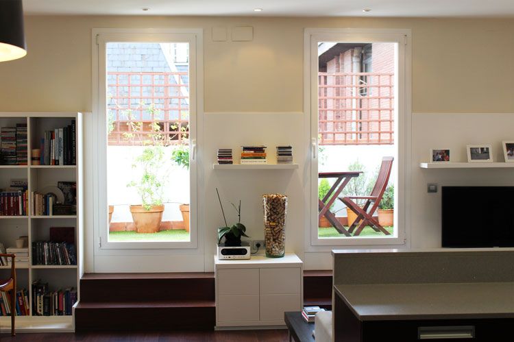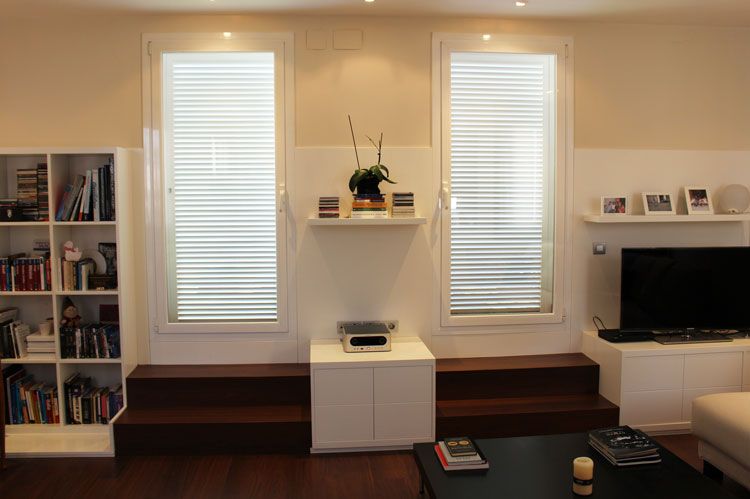 Pentru zona de zi, s-a obtinut un spatiu unitar, in care livingul comunica direct cu bucataria, dar separate vizual pentru a le pune in evidenta. Decorul minimalist face intreaga amenajare sa para aerisita. Cele 2 scari care conduc spre terasa, ajuta la o impartire oarecum intuitiva a livingului in mai multe subfunctiuni. Avem astfel o zona de conversatie cu canapea si televizor, pentru ca in celalalt capat sa mergem spre o biblioteca cu un colt de lectura si un birou.