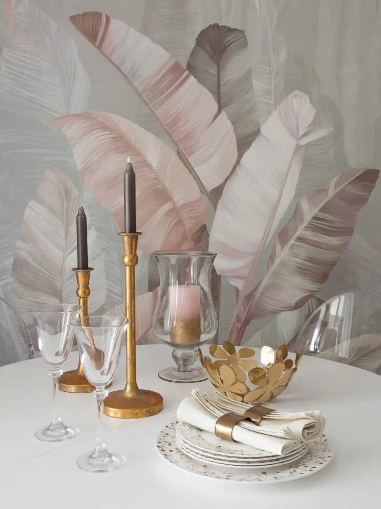 Zona de dining este un spatiu diafan cu un corp de iluminat central, finisat alb cu brate aurii, care confera un plus de eleganta. Tapetul pastelat si vopseaua decorativa intr-o nuanta de verde-gri deschis au rolul de a accentua, prin contrast, mobilierul minimalist, in tonuri de alb.
