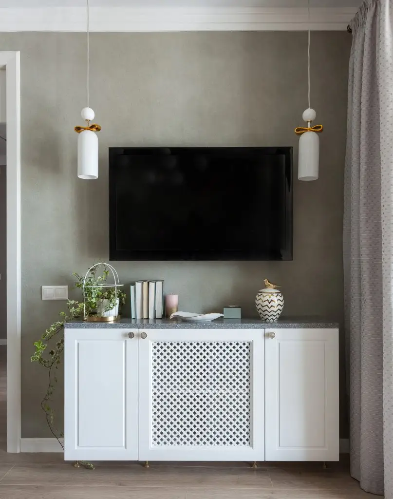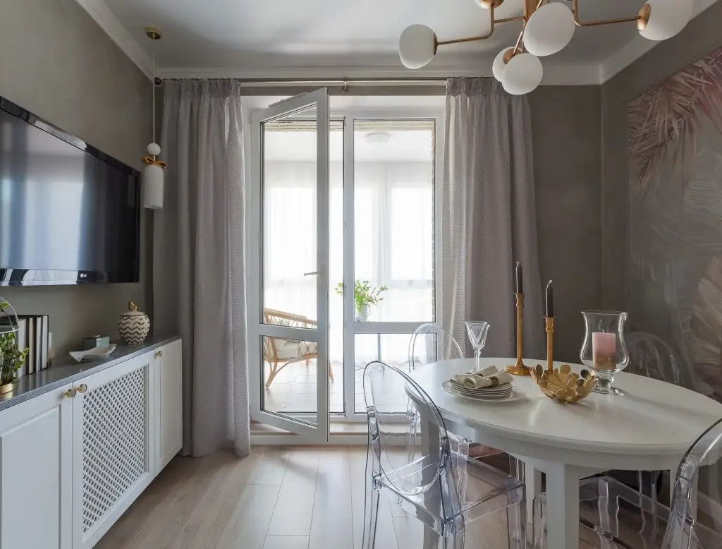 Masa de dining, cu blat rotund, si scaunele din plastic transparent ocupa putin spatiu si in acelasi timp contribuie la atmosfera luminoasa si feminina a locuintei. Comoda de sub televizor este pusa in evidenta de cele doua corpuri de iluminat simetrice.