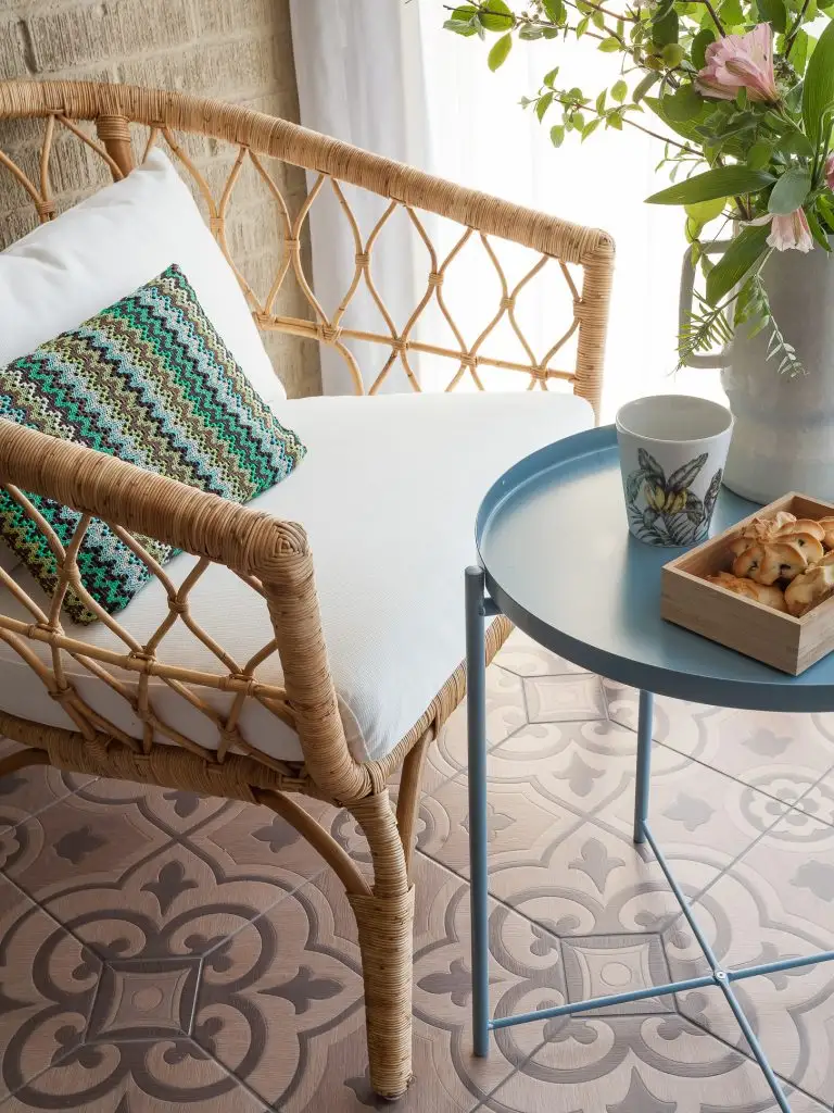 Livingul, de doar 11 metri patrati, este un spatiu intim, confortabil si practic, mobilat cu o canapea extensibila de 140 cm, o masuta de cafea, din metal, si un fotoliu din rattan. Impreuna cu pardoseala din placi terazzo decorativ, culorile si materialele mobilierului contribuie la crearea unei atmosfere de vacanta in mini-livingul organizat in logie.