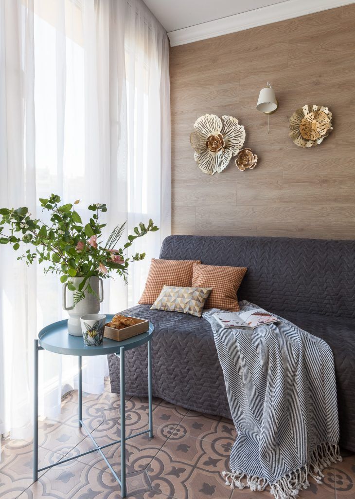 Livingul, de doar 11 metri patrati, este un spatiu intim, confortabil si practic, mobilat cu o canapea extensibila de 140 cm, o masuta de cafea, din metal, si un fotoliu din rattan. Impreuna cu pardoseala din placi terazzo decorativ, culorile si materialele mobilierului contribuie la crearea unei atmosfere de vacanta in mini-livingul organizat in logie.