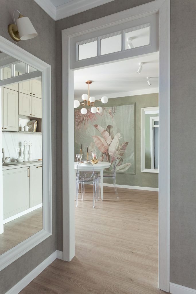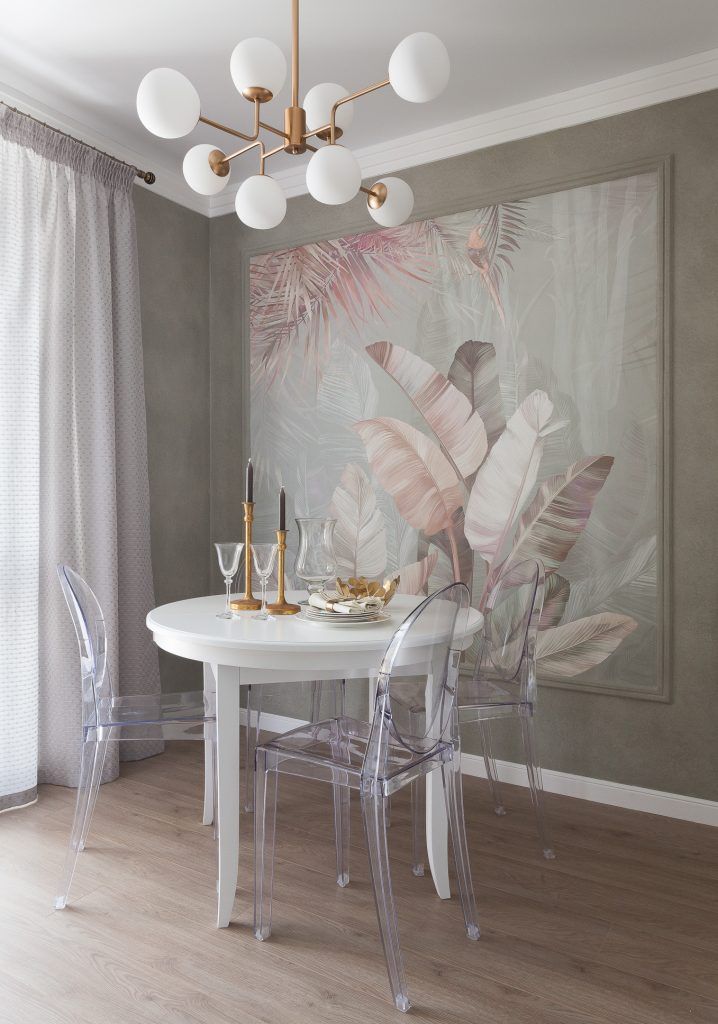 Zona de dining este un spatiu diafan cu un corp de iluminat central, finisat alb cu brate aurii, care confera un plus de eleganta. Tapetul pastelat si vopseaua decorativa intr-o nuanta de verde-gri deschis au rolul de a accentua, prin contrast, mobilierul minimalist, in tonuri de alb.