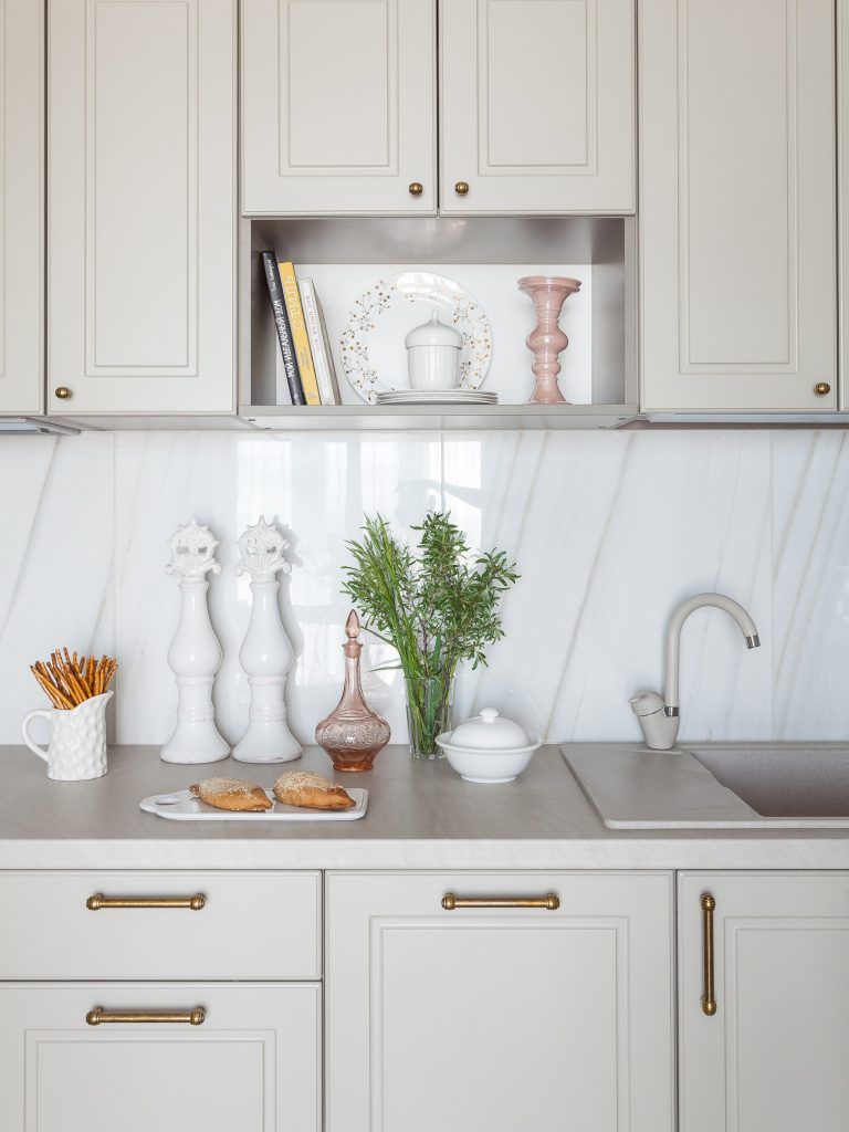 In bucatarie au fost integrate accente clasice prin profilatura mobilierului si optiunea pentru un backspalsh din portelan cu efect de marmura alba cu venatura pronuntata. Blatul din mdf laminat de culoare bej completeaza armonios ansamblul de mobilier al bucatariei.