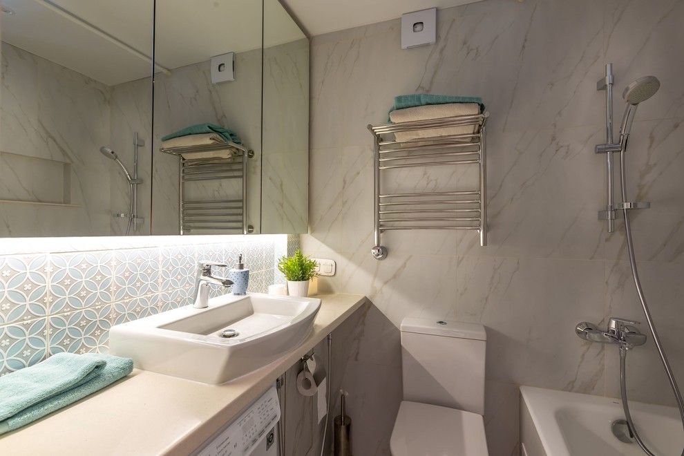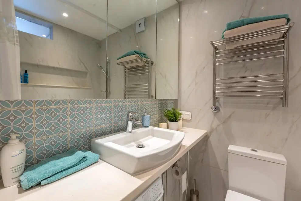 Simplitatea cu care este gandita baia exprima naturalete si lux accesibil. Vorbim in acest caz de folosirea non-culorilor. Functional si totodata practic, dulapurile baii pozitionate deasupra lavoarului sunt mascate cu oglinzi, sub acestea regasindu-se o banda de led, metoda de iluminare subtila si romantica, perfecta pentru un cadru de relaxare modern.