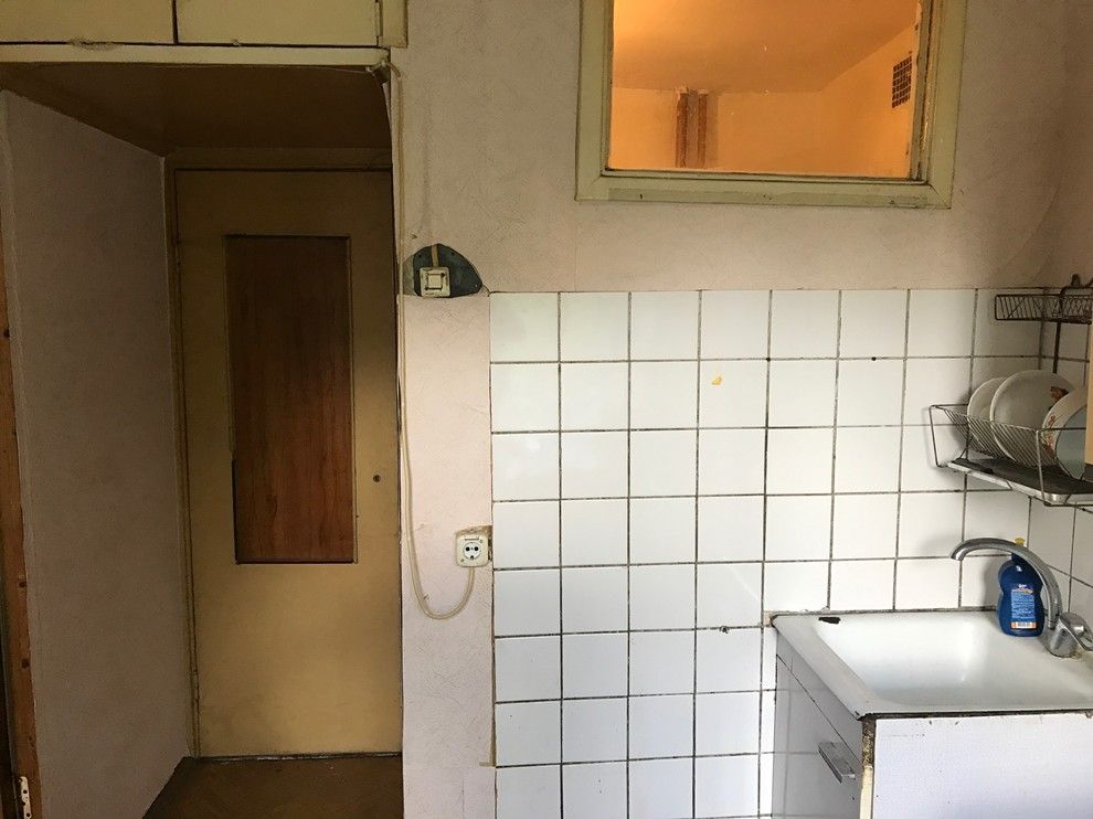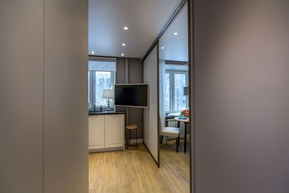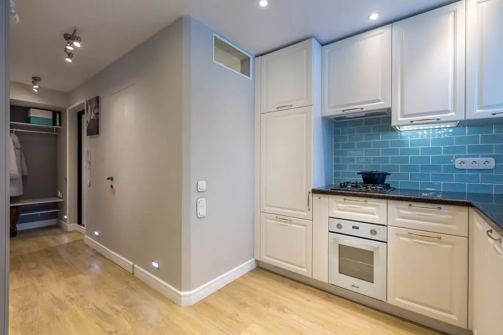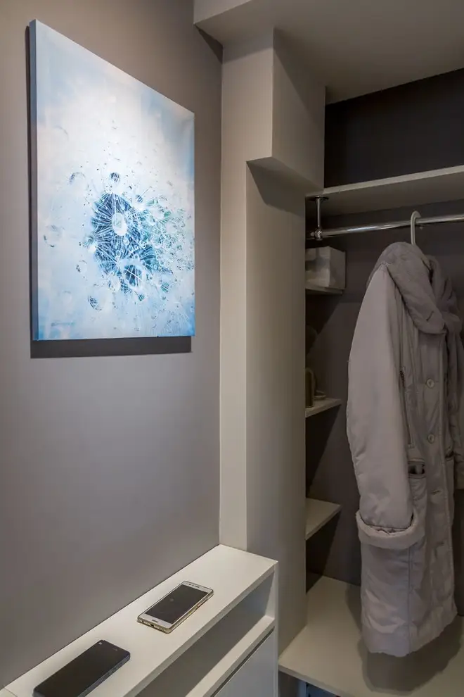 Tocmai datorita spatiului mic, se renunta la mobilierul sub forma de biblioteca si se opteaza doar pentru mobilierul bucatariei cu un design simplu si elegant ce permite scoaterea in prim plan a placilor de faianta in nuante de turcoaz si manerelor aurii in stil vintage. Trecerea catre zona propriu-zis dedicata relaxarii se face printr-un perete fals, glisant si a unei mese pozitionate central.