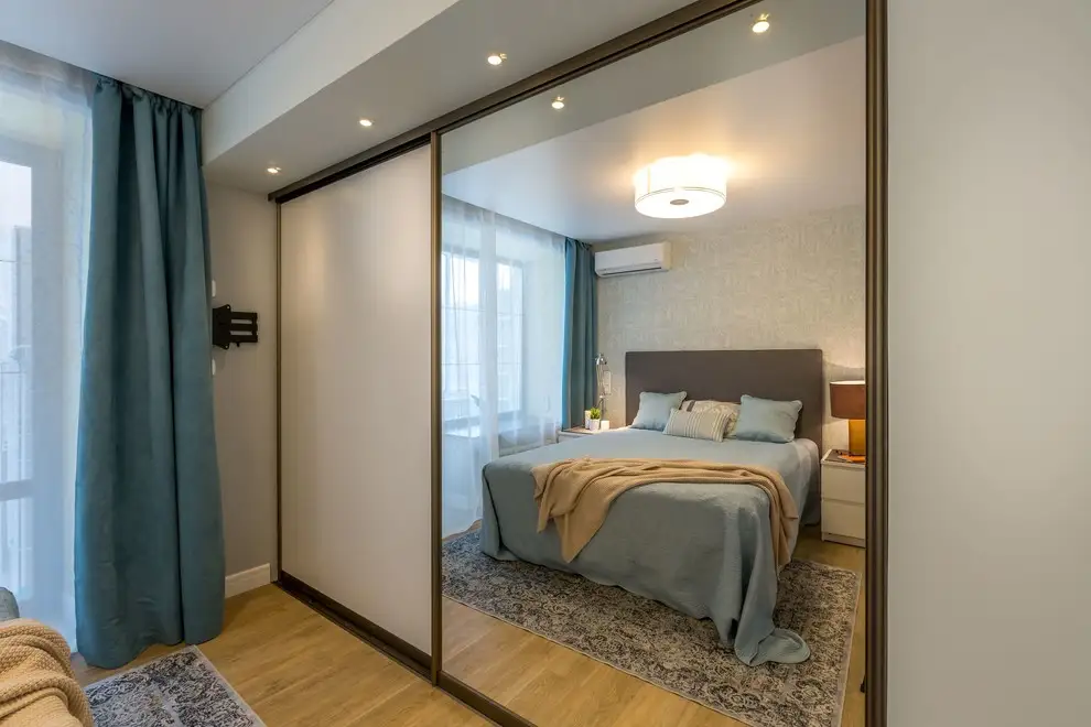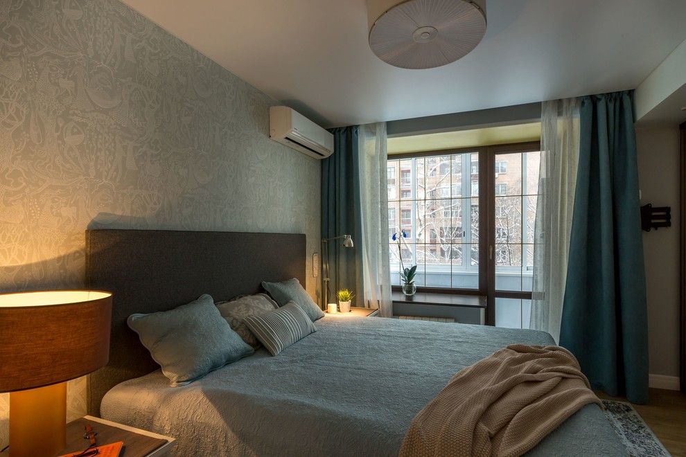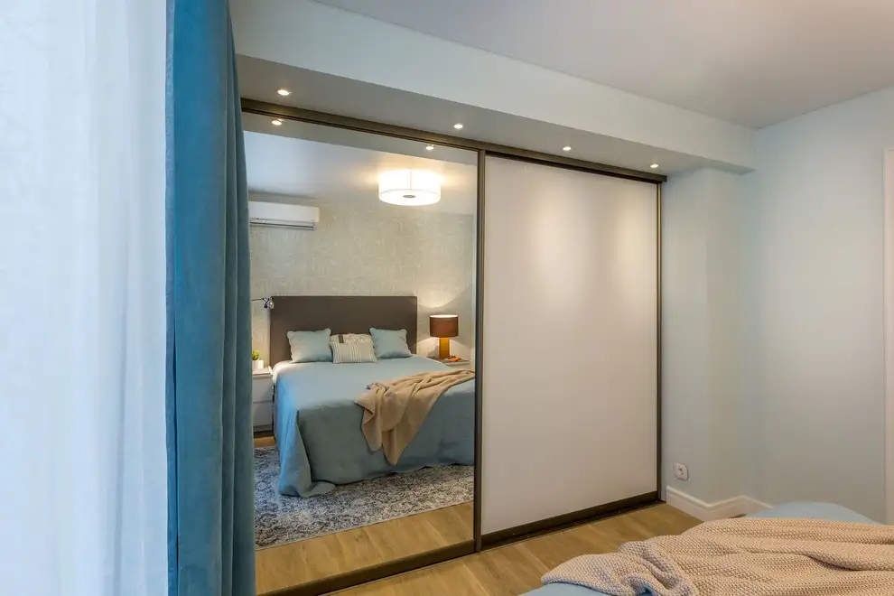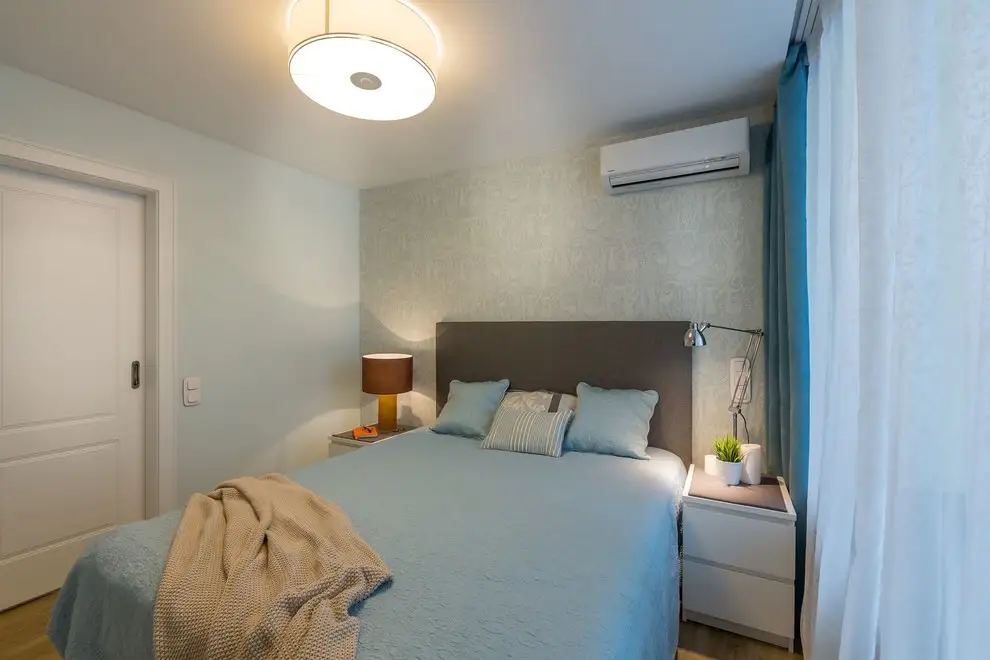 Dormitorul matrimonial mentine ritmul scandinav pastrand nuantele de bleu, gri si verde natural si pozitioneaza central un pat dublu de dimensiuni generoase. Lumina naturala patrunde din plin in incinta incaperii si alaturi de dressing-ul de mari dimensiuni prevazut cu oglinzi si elementele de iluminat artificial, maresc incaperea din punct de vedere vizual.