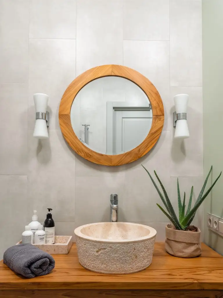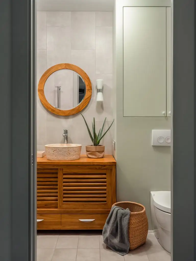 Baia se transforma intr-un loc complet dedicat relaxarii intr-un mod calitativ. Lemnul natural regasit in mobilier si rama oglinzii, design-ul corpurilor sanitare si accesoriile naturale, nu fac altceva decat sa accentueze ideea unui propriu spa de lux.